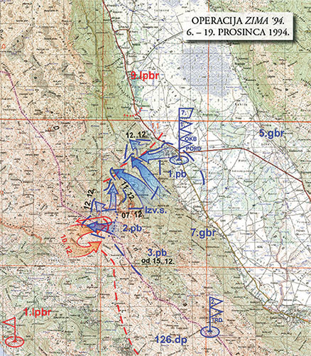 Karta s ucrtanim vojnim napredovanjima tijekom vojne operacije »Zima-94« u razdoblju 6. – 19. prosinca 1994.