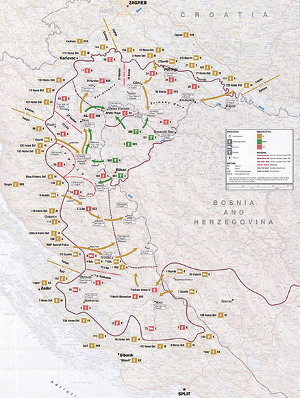 »Napadnu operaciju sa radikalnim ciljem i odbranom na ostalim delovima fronta najverovatnije će izvršiti u zoni: Sveti Rok, Donji Lapac, Šturlić, r. Mrežnica, grupisati g/s na pravcu: Ogulin – Slunj – Rakovica – Tržac, a pomoćne na opštim pravcima: Otočac – Pl. jezera (Korenica) i Gospić – Udbina. Verovatni cilj agresije bio bi da uz upotrebu HD (helikopterskog desanta – moja napomena) u širem reonu Rakovice i s. Podlapača i sadejstvom snaga 5. K vojske muslimansko-hrvatske federacije BiH sa pravca Tržačka Raštela – Rakovica, u prvoj etapi ovlada linijom: Slunj – Rakovica – Babin Potok – Ljubovo – s. Ploče, a potom u drugoj etapi, uvođenjem svežih snaga, spoji se sa 5. K vojske MHF BiH izbije na gornji tok r. Una«.