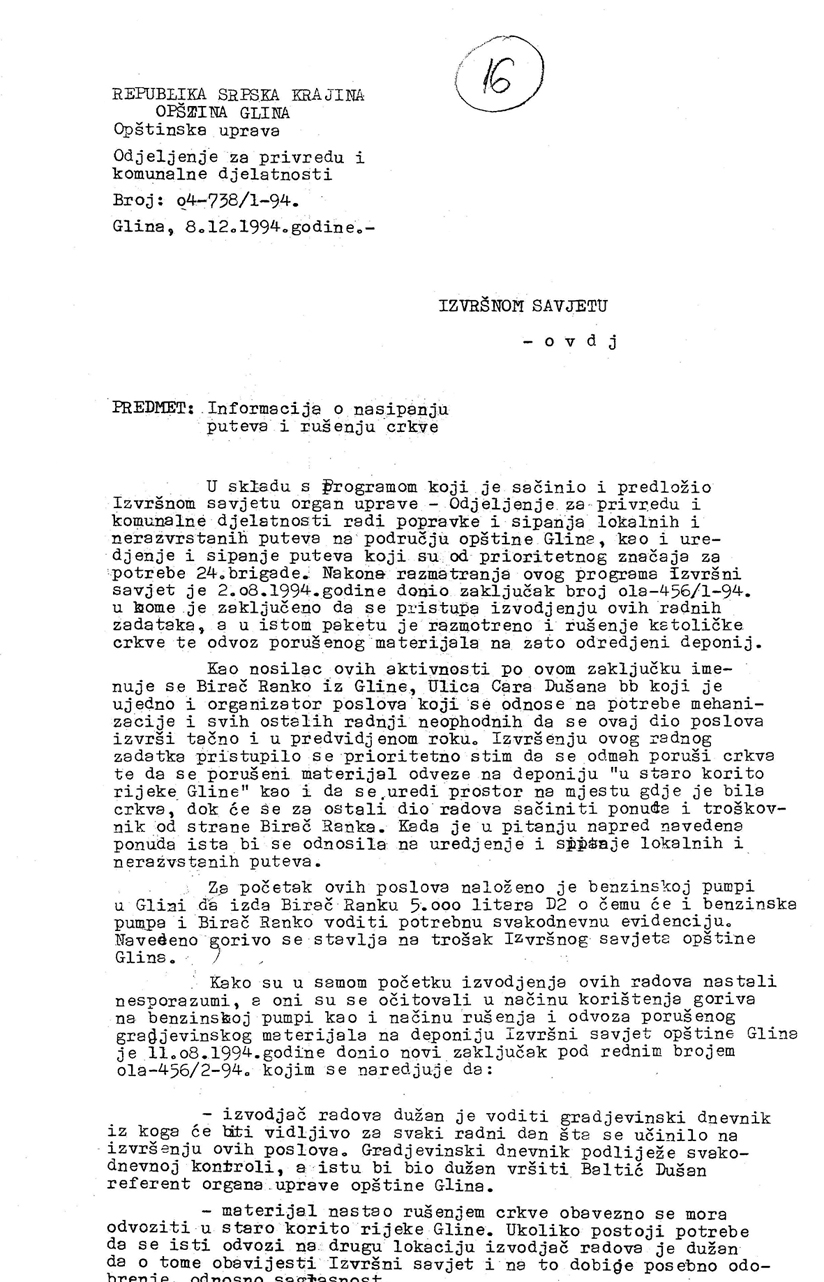 Iz izvješća Općinske uprave Glina o namjernom rušenju katoličke crkve u Glini i uređenju lokalnih prometnica materijalom nastalim među ostalim i rušenjem crkve (Republika Hrvatska i Domovinski rat 1990. – 1995., Knjiga 14., HMDCDR – Hrvatski institut za povijest – Podružnica za povijest Slavonije, Srijema i Baranje, Zagreb – Sl. Brod, 2013)
