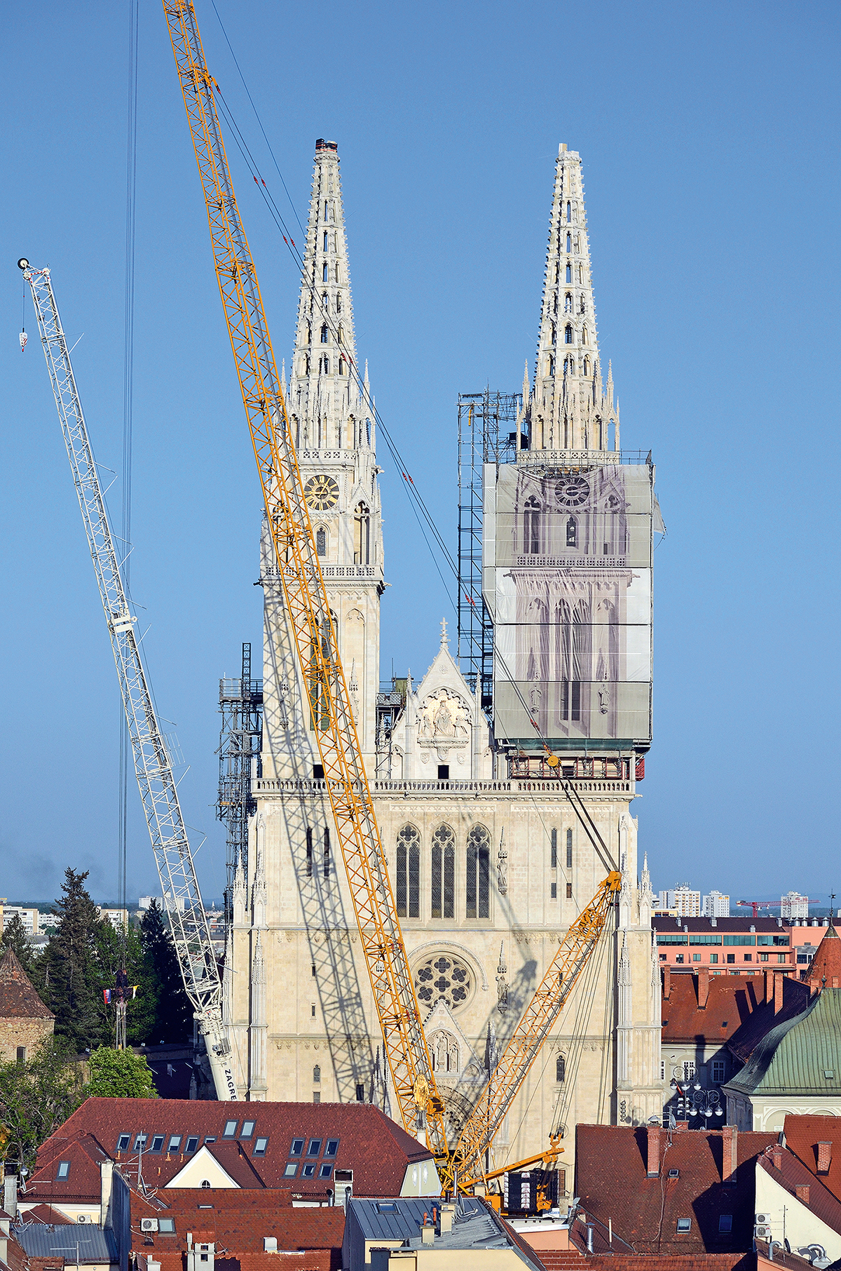 Vrh sjevernog tornja, smješten sa sjeverne strane glavnog pročelja katedrale, stanje 6. rujna 2020. (Dragan Damjanović, Veliki zagrebački potresi, str. 222)