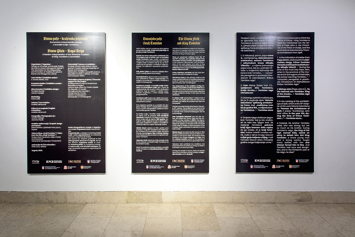 Kako bi se još više istaknuo kontekst društvenog sjećanja, sam naziv izložbe spaja projekt s deseteračkim stihom gange – višeglasnog netemperiranog napjeva karakterističnog za dinarsko kulturno područje, koja se kao dio pučke tradicije pjeva na Duvanjskom području: Duvno polje, kraljevsko prijestolje / Tu je slava kralja Tomislava. Koncipirana u tri cjeline, izložba obuhvaća dizajnirane i izrađene kraljevske insignije i odjeću, djela suvremenih slikara nadahnuta doživljajem krajolika Duvanjskog polja i okolice te umjetničke fotografije povijesnog uprizorenja krunidbe. Autori pojedinih izložaka, svjesni historiografskih prijepora oko povijesnosti čina Tomislavove krunidbe, kao i nedostatka materijalnih dokaza, a nastojeći se odmaknuti od slobodnih likovnih interpretacija (slikarstvo, kiparstvo, medaljarstvo...) 19. i 20. stoljeća, inspiraciju su potražili u starohrvatskoj srednjovjekovnoj umjetnosti, uglavnom elementima arhitektonske dekoracije s kamenih ulomaka u Dalmaciji i susjednom području Bosne i Hercegovine, kao jedinom mogućem autentičnom izvoru. Tako su kao temeljni motivi za stilizaciju (primijenjeni na kruni, plaštu i prijestolju) te ujedno središnji motivi cijeloga projekta odabrani pleter i tzv. Duvanjski križ – grobni nalaz iz nekropole u Koritima na Buškom jezeru koji datira vjerojatno iz 6. stoljeća, a vezuje se uz domaće ilirsko, delmatsko stanovništvo – s pripadajućim zoomorfnim detaljima (ptica).