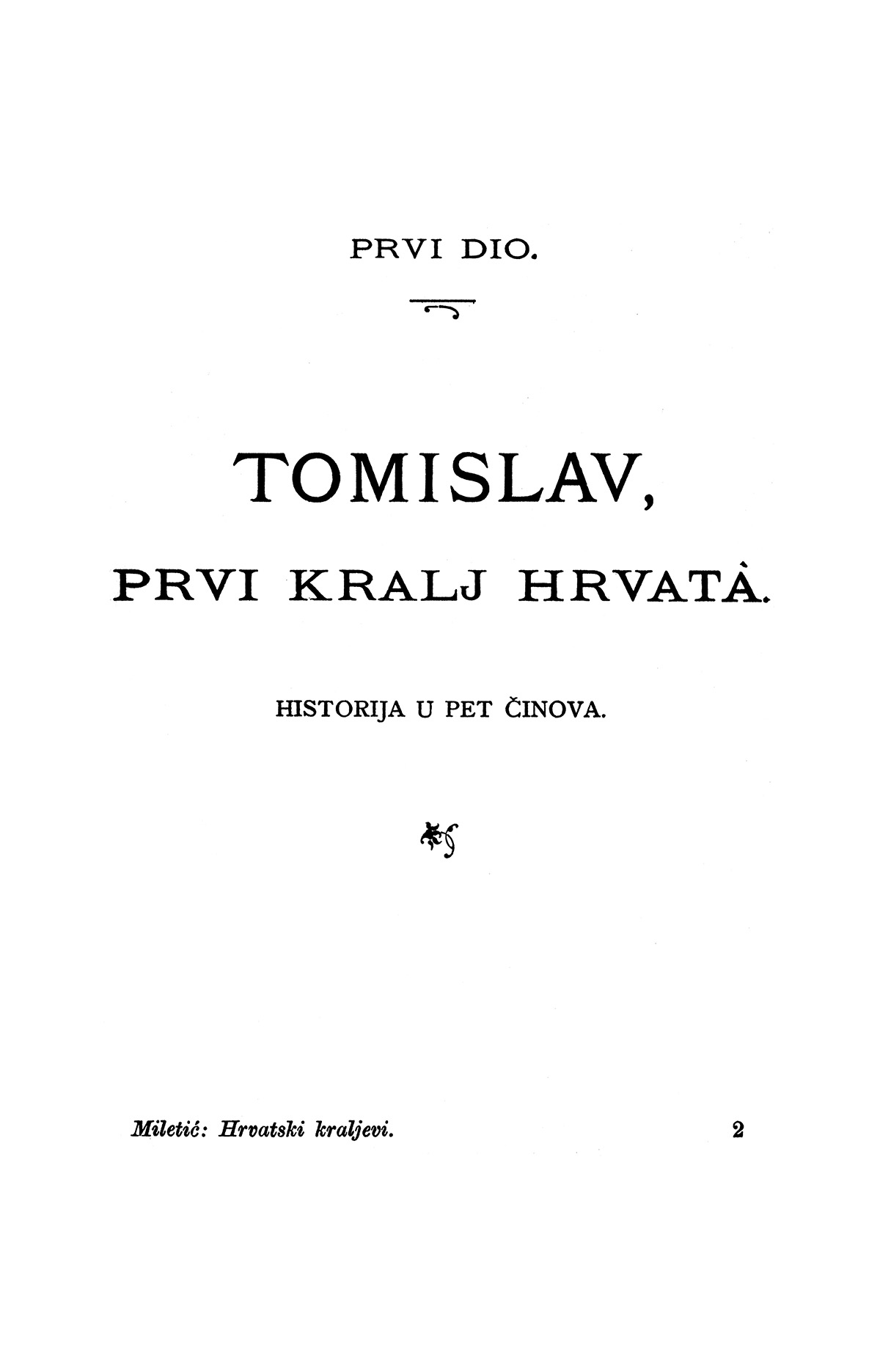 [11] Primjera radi, evo kratkih izvadaka iz potanka opisa krunidbe – dakle jednoga od prizora zajedničkih Tresiću i Miletiću – iz drugoga, posljednjeg prizora petog čina, koji se, prema Miletiću, zbiva »[n]a duvanjskom polju (17. ožujka 927)« (Miletić 1902: 269): »Iz crkve izlazi krunitbena povorka. Najprije sjajna kraljeva straža u oklopima, srebrnim i pozlaćenim šljemovima, sa štitom u jednoj, a kopljem u drugoj ruci. Vojska se postavi u zadak pozornice, a naprijed narod (koji se mora slobodno kretati). Iza vojnika izlazi svećenstvo latinsko i hrvatsko, sve u sjajnom ornatu (...) Iza njih stupaju hrvatski dostojanstvenici. (...) Izlazi dvanaest poglavica od dvanaest plemena hrvatskih, a svakoga prati po jedan štitonoša, te župani i banovi, pak bugarski i srpski poslanici, zatim slijede: djed Hrvata, župan mačonoša (...), župan štitonoša (...), župan peharnik (...), župan posteljnik (...), župan ubrusar (...), župan ključar (...). – Župan psar (...), župan sokolar (...), župan konjušnik (...) dolaze sa strane i t. d. – Napokon se ukaže na vratima crkve Tomislav, pod crvenim baldahinom (...) u sjajnom odijelu grimiznom, posutom biserjem, ali još bez krune (...)« (isto: 278; likove istaknuo autor, nap. B. S.).