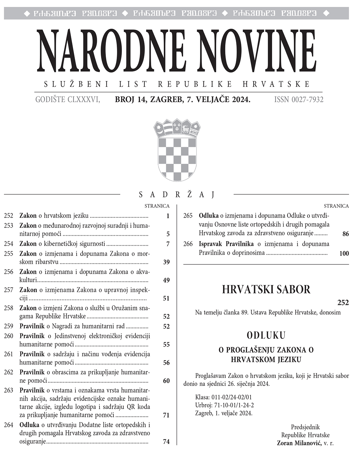 tema ovoga broja Hrvatske revije jest Zakon o hrvatskom jeziku i rad Vijeća za hrvatski jezik. Kao autori četiriju priloga pojavljuju se neki od članova Matičina povjerenstva za prijedlog Zakona i/li neki od sadašnjih članova Vijeća za hrvatski jezik koje je osnovano u skladu sa Zakonom 1. kolovoza 2024., a svoju ustanoviteljsku sjednicu održalo je 23. listopada 2024. upravo na dan kada je 1847. na Kukuljevićev prijedlog Sabor donio zaključak o uvođenju hrvatskoga jezika kao službenoga jezika u javnoj uporabi.