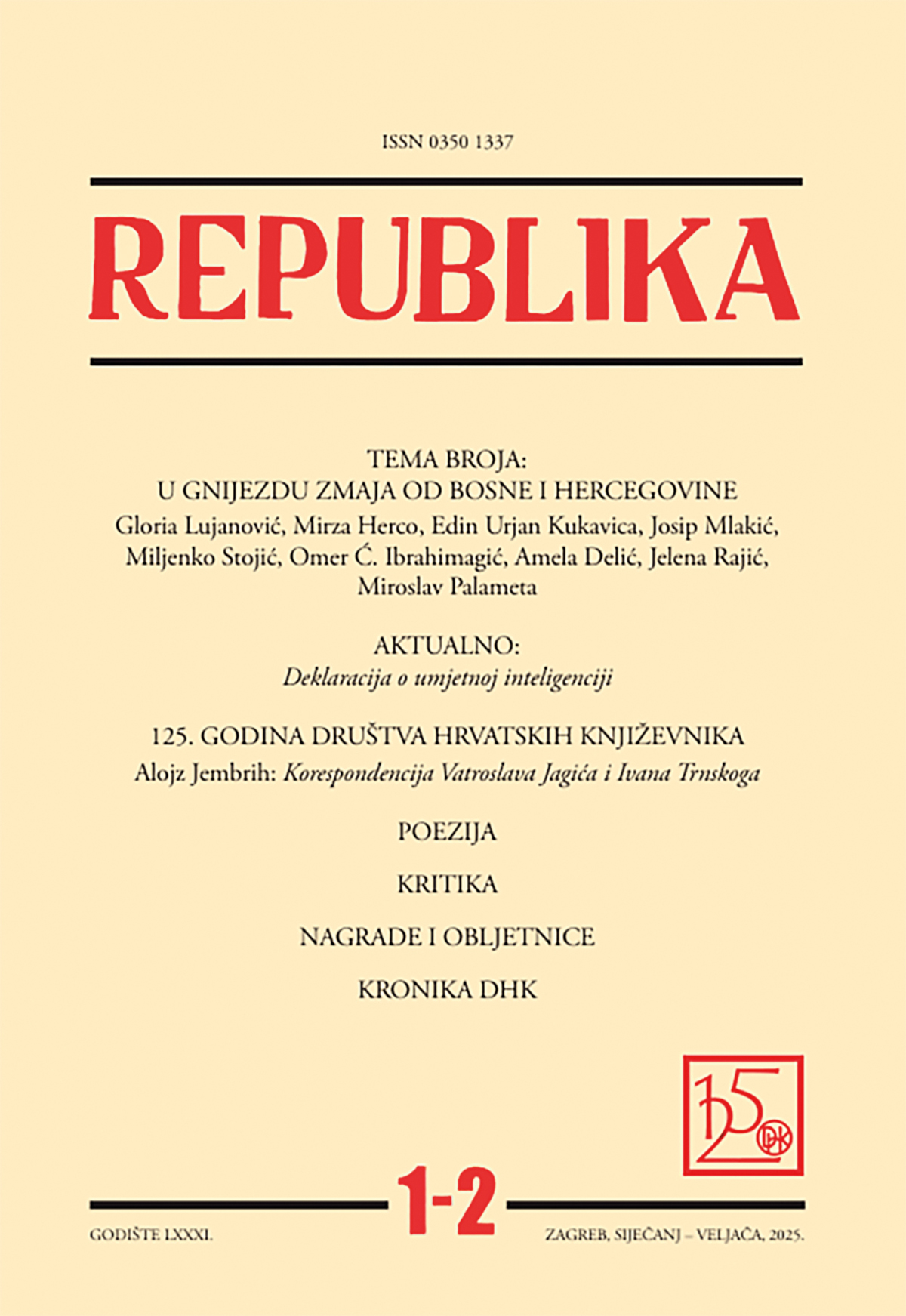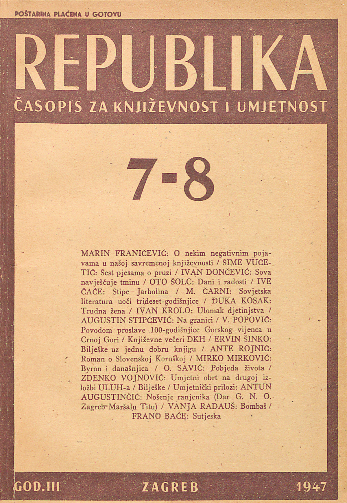 Republika, mjesečnik za književnost, umjetnost i javni život, DKH, Zagreb, br. 1 (1945); mjesečnik za književnost, umjetnost i javna pitanja, DKH, Zagreb, br. 3 (1947); časopis za književnost i umjetnost, DKH, Zagreb, br. 5–6 (1979); časopis za kulturna i društvena pitanja, DKH, Zagreb, br. 1–2 (1980); časopis za književnost, DKH, Zagreb, br. 3–4 (1990); mjesečnik za književnost, umjetnost i društvo, DHK, Zagreb, br. 10 (2015), 1–2 (2024)