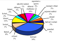 Sljedeći grafikon prikazuje sastav posjetilaca dubrovačkih krčmi. Iako je grafikon načinjen samo na osnovu zabilježenih slučajeva koji su se dogodili u krčmi u razdoblju od polovice 14. do polovice 15. stoljeća, smatram da barem približno odražava odnos zastupljenosti pojedinih društvenih grupa među posjetiteljima krčme tijekom čitavog srednjovjekovlja. Sasvim je očito da je većina dolazila iz sloja sitnih obrtnika (53%). Slične rezultate pokazala su i istraživanja u srednjoj Europi.68 Ostale grupe razmjerno su slabo zastupljene (zajedno manje od 50%). Među njima jedino se grupe famuli i ostali ističu svojom brojnošću prelazeći 10%. Međutim, glede famula valja istaknuti da oni nisu zalazili u krčme kako bi se zabavljali, nego je vjerojatnije da su tamo išli kupovati vino za svoje gospodare. S druge strane, grupa ostali vrlo je raznolika, sastavljena od osoba koje izvori navode samo prema njihovu imenu, bez zanimanja. Stoga se može pretpostaviti da se unutar ove grupe nalaze mali obrtnici, ali i stranci, putnici, te trgovci. Sljedeća grupa po brojnosti, najamni radnici, sastavljena je većinom od gradskih nosača, koji su najvjerojatnije provodili vrijeme u krčmi čekajući da netko unajmi njihove usluge. Iduća grupa, državni službenici, sastoji se od različitih osoba u službi Dubrovačke Republike. Najčešće su to bili teklići, kneževi momci i mjerači vina, za koje ne možemo biti sigurni jesu li u krčmu zalazili po službenoj dužnosti ili da se i sami okrijepe. Među posjetiteljima krčme ne možemo naći plemiće, ni više državne službenike Republike. Njima zalaženje u krčmu s prostim pukom nije bilo primjereno. Grupa tekstilnih radnika javlja se u prvoj polovici 15. stoljeća, kada je Petar Pantella u gradu organizirao manufakturu tkanina. Kako ovaj grafikon prikazuje stanje iz razdoblja kada se ova grupa tek počinje formirati, lako je moguće da je u kasnije vrijeme ova grupa u smislu posjetitelja krčmi bila i brojnija. Kao posjetitelji gradskih krčmi jednako brojni bili su i zaposleni u agraru (većinom vrtlari i radnici u polju).