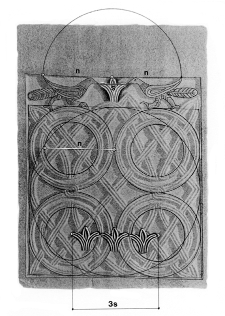 Mogućnost odnosno vjerojatnost da je majstor odredio kanonski format temeljnoj, primarnoj veličini pluteja, uputila nas je na provjeru drugih mjera – na analizu formata reljefa, i veličina ornamentalnih motiva: krugova, dijagonala i troprutih vrpci – u ovom pluteju glavnih elemenata pleternog ornamenta.
