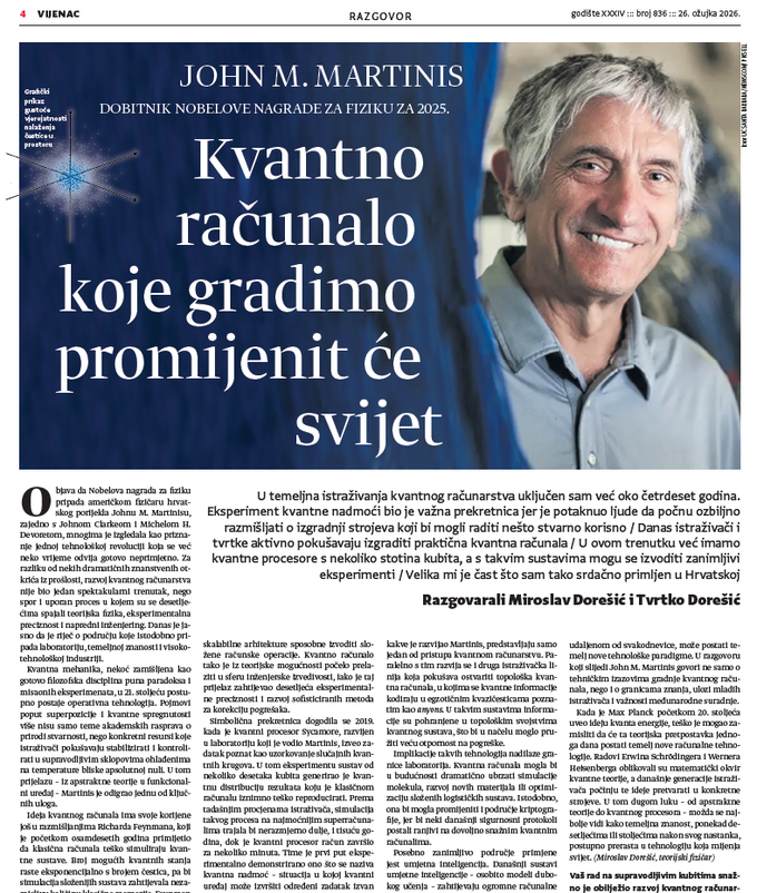 U novom broju središnjih nacionalnih novina za kulturu koji publicira Matica hrvatska, dostupom na kioscima sljedećih 14 dana, Martinis, u razgovoru s teorijskim fizičarem Miroslavom Dorešićem i matematičarem Tvrtkom Dorešićem potanko objašnjava rezultate svojih istraživanja koje su dovele do Nobelove nagrade za fiziku za 2025.: