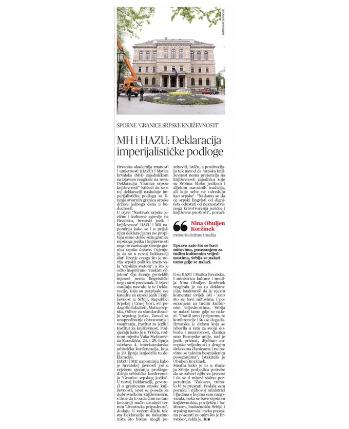 Glas Istre, Glas Slavonije, Večernji list, jutarnji.hr, danas.hr, hkm.hr, glasistre.hr, glasistre.hr, magazin.hrt.hr: Nastavak srpske jezične i kulturne agresije na Hrvatsku, hrvatski jezik i književnost