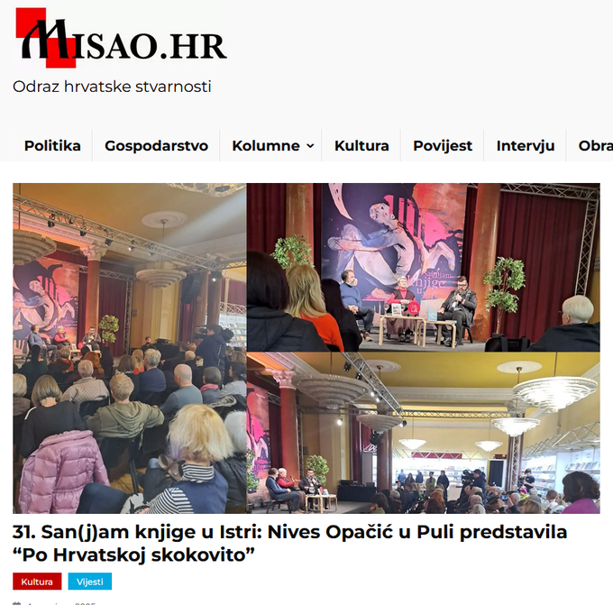 Na ovogodišnjem, 31. Sa(n)jam knjige u Istri koji je otvoren 28. prosinca i traje sve do 7. prosinca u Puli, uz brojne hrvatske nakladnike, svoju bogatu nakladničku djelatnost predstavlja i Matica hrvatska. U okviru festivala koji broji 97 programa s više od stotinu sudionika, knjigu je predstavila i poznata hrvatska jezikoslovka, Matičina autorica i kolumnistica “Vijenca”, Nives Opačić i to u programu “Pisac kao putnik, Nemiri”. (misao.hr, 4. prosinca 2025).