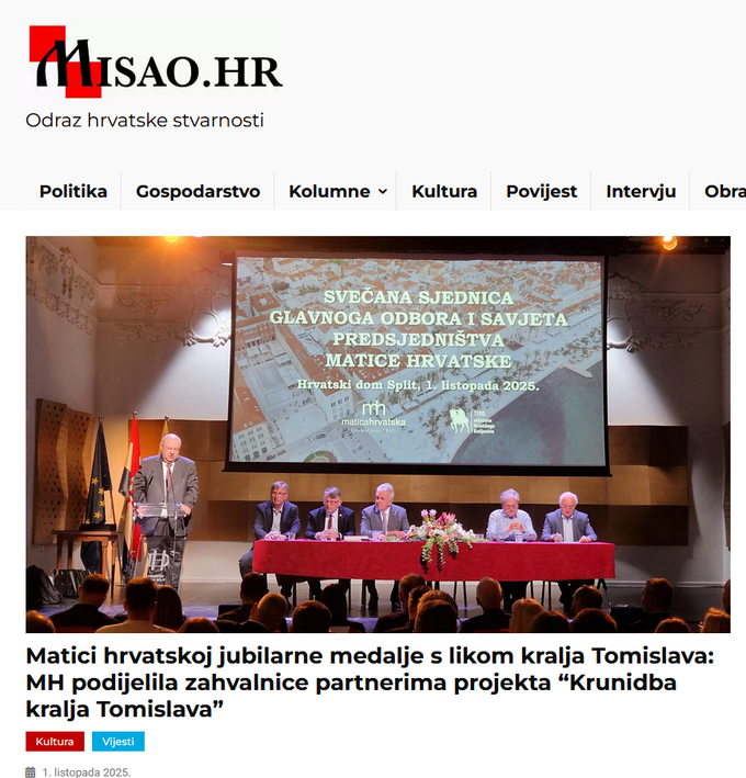 Blaženku Bobanu, županu Splitsko-dalmatinske županije, Vicku Bilandžiću, intendantu HNK Split te Ivanu Vukoju, ravnatelju HNK Mostar, predsjednik MH Damir Zorić uručio je danas zahvalnice na svečanosti u Hrvatskom domu u Splitu, dok je župan Boban dodijelio jubilarne medaljone s likom kralja Tomislava, predsjedniku MH, članovima Glavnog odbora MH i akademiku Miri Gavranu, autoru libreta (Misao.hr, 1. listopada 2025).