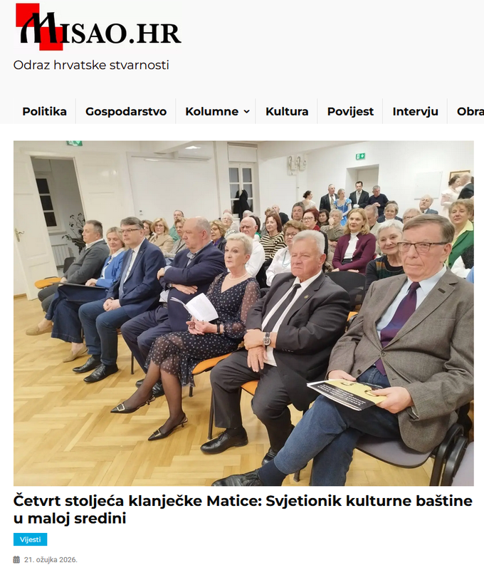 U Klanjcu je u prostoru gradske knjižnice svečano obilježena 25. obljetnica obnovljenog djelovanja Ogranka Matice hrvatske u Klanjcu. Događaj je okupio brojne kulturne djelatnike, uzvanike i ljubitelje baštine. Središnji dio programa bilo je predstavljanje knjige „Ogranak Matice hrvatske u Klanjcu: 25 godina djelovanja“ autora Nikole Filka i Snježane Horvatin, koja donosi pregled bogate izdavačke i kulturne aktivnosti ogranka. Predsjednica ogranka Marina Krpan Smiljanec istaknula je kako 25 godina rada predstavlja cijelu jednu generaciju te naglasila važnost očuvanja kulturne baštine kroz brojne projekte i više od 50 objavljenih izdanja.Okupljenima se obratio i predsjednik Matice hrvatske Damir Zorić, koji je klanječki ogranak istaknuo kao primjer uspješnog i aktivnog djelovanja na lokalnoj razini, naglasivši njegov doprinos očuvanju jezika i kulturnog identiteta. Na obilježavanju je osim predsjednika sudjelovao i potpredsjednik MH Mario Jareb.