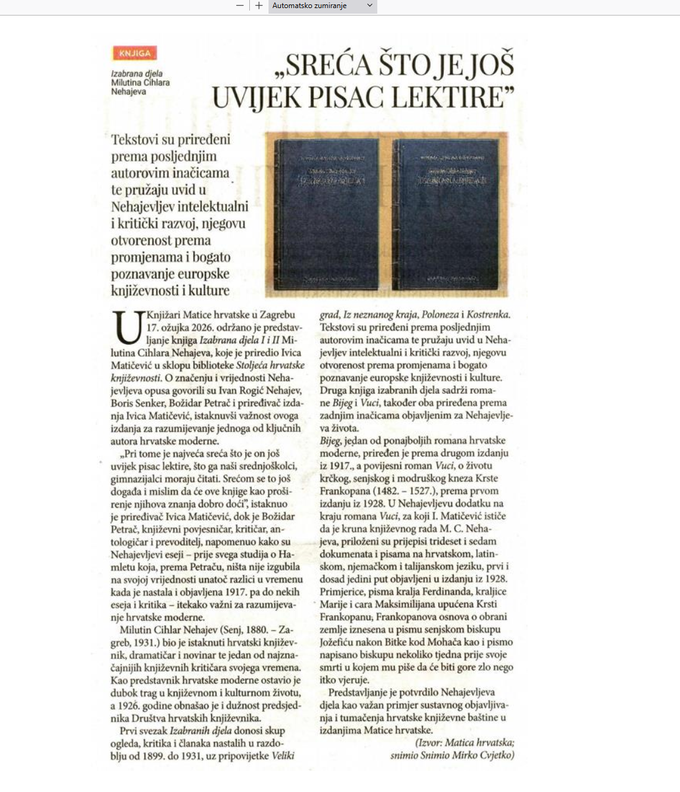 U knjižari Matice hrvatske u Zagrebu 17. ožujka održano je predstavljanje knjiga Izabrana djela I i II Milutina Cihlara Nehajeva, koje je priredio Ivica Matičević u sklopu biblioteke Stoljeća hrvatske književnosti.