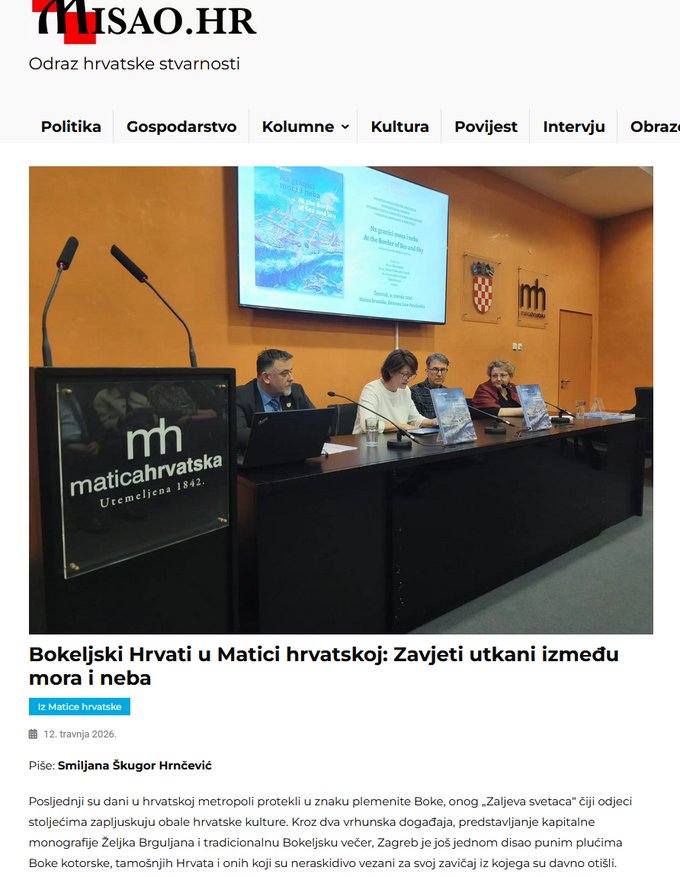 Detaljnije o predstavljanju možete pročitati na portalu Misao.hr Bokeljski Hrvati u Matici hrvatskoj: Zavjeti utkani između mora i neba.