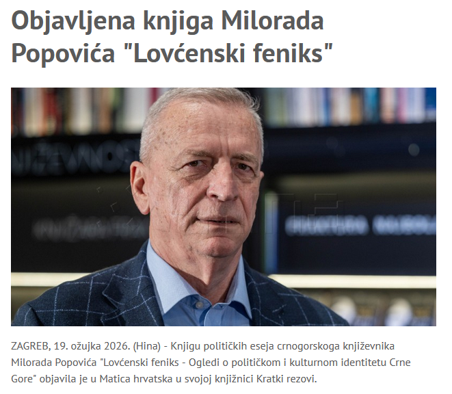 Knjigu političkih eseja crnogorskoga književnika Milorada Popovića "Lovćenski feniks - Ogledi o političkom i kulturnom identitetu Crne Gore" objavila je u Matica hrvatska u svojoj knjižnici Kratki rezovi. (Hina, 19. ožujka 2026).