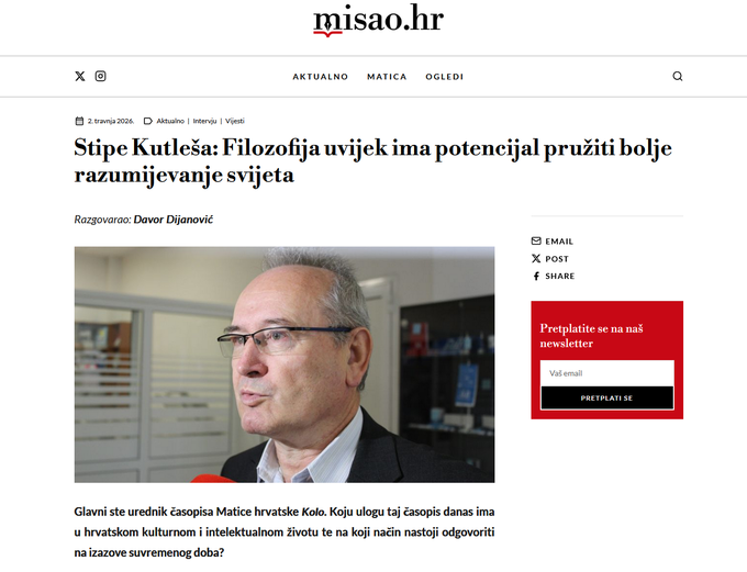 Glavni urednik časopisa Matice hrvatske Kolo te bivši pročelnik Odjela za filozofiju Matice hrvatske Stipe Kutleša u intervjuu s Davorom Dijanovićem za misao.hr razgovarao je o svom znanstvenom radu, o ulozi časopisa Kolo i Matice hrvatske te o položaju filozofije u suvremenom društvu.