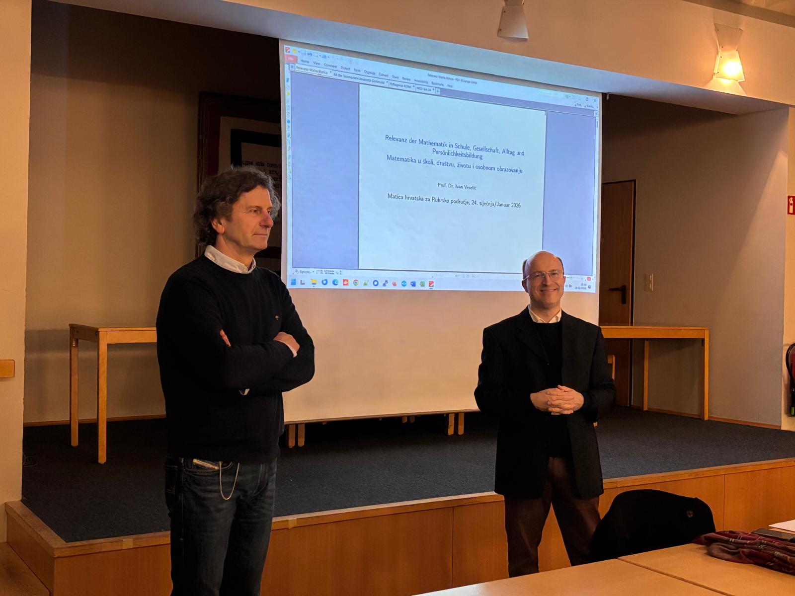 Matica hrvatska za Ruhrsko područje je u sklopu niza kulturnih i informativnih predavanja u Hrvatskoj katoličkoj misiji u Essenu, u subotu 24. siječnja održala predavanje sveučilišnog profesora matematike Ivana Veselića na temu „Matematika u školi, društvu, svakodnevnom životu i osobnom obrazovanju“. Predavanje je održano na hrvatskom, a budući da su slajdovi prezentacije bili na njemačkom jeziku, bilo je dostupno raznolikoj publici.
