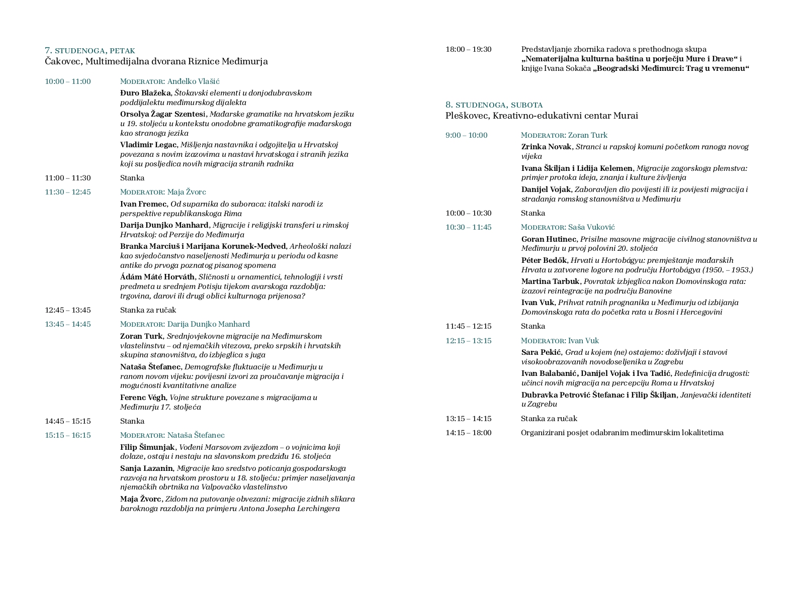 Svečano otvorenje skupa u 10:00 sati i njegov prvi dan odvijat će se u Sokolskom domu u Murskom Središću, drugi dan u multimedijalnoj dvorani Riznice Međimurja u Čakovcu, a treći u Kreativno-edukativnom centru „Murai“ u Pleškovcu. Detaljan program skupa nalazi se u privitku.