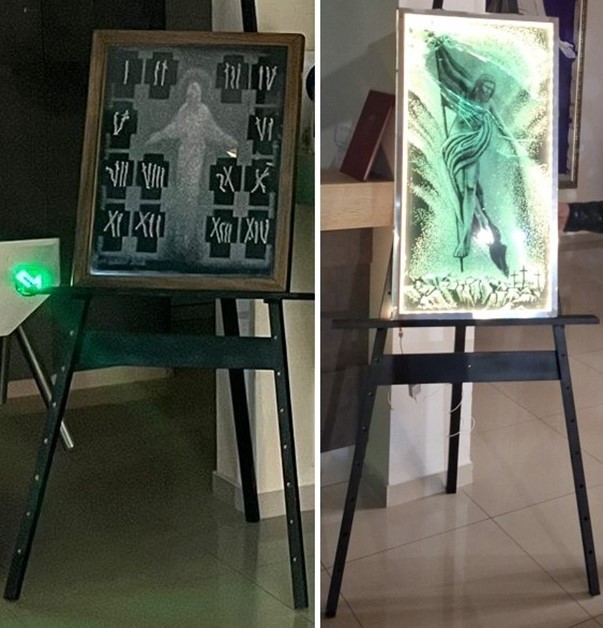 "Što više tehničkih vještina imate, to bilje možete predstaviti svoje ideje", rekao je suvremeni švicarski umjetnik Simon Berger koji je, udarajući staklo čekićem, stvaro čak i kada je uništavao. Udarajući staklo čekićem stvara se jedinstven način kreiranja umjetničkih djela u kojem staklena ploča postaje i podloga i medij. To je likovna tehnika kojom se, zahvaljujući originalnoj i jedinstvenoj prirodnoj strukturi i transparentnosti materijala, u konačnici stvara potpuno nov, dosad neviđeni vizualni efekt. Što su udarci brži i kraći, to su kontrasti i nijanse jače. Ovisno o kutu gledanja, boji pozadine, vrsti, boji i količini svjetla, ova likovna tehnika u svakom trenutku ostvaruje drugačiji vizualni efekt i doživljaj. U svakom idućem trenutku reproducira se na drugi način, dakle, u bezbroj varijanti, a upravo je to ono što nam prilikom likovnog uprizorenja Kristovog uskrsnuća daje puno više mogućnosti od bilo koje druge likovne tehnike, barem meni", poručio je Mate Ljubičić objašnjavajući posebnost likovne tehnike u kojoj su izrađena izložena djela.