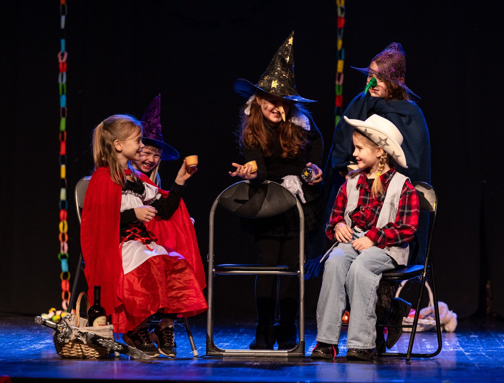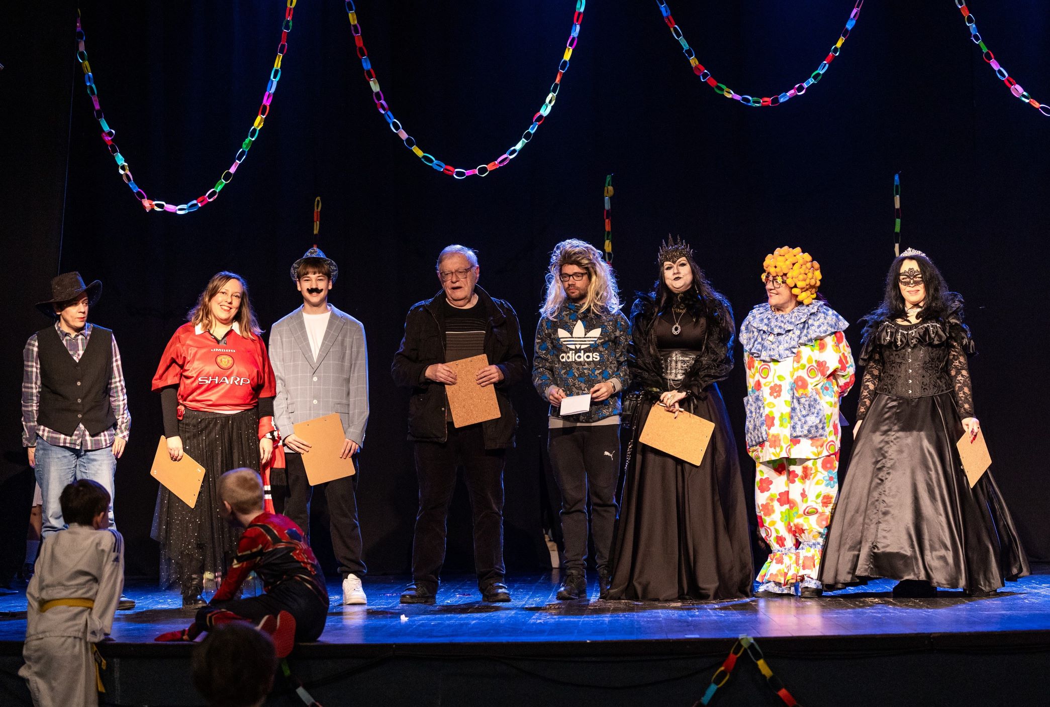 Maskirane glumice i glumci, samo dio brojnog ansambla Kazališta Škrabe iz Jastrebarskog, Zagreba i Klinča Sela su glumili, smislili vlastite priče, dijaloge i scenski pokret, plesali su, osmišljavali kostime i izrađivali scenografiju, a bilo je tu i vještica i lovaca na vještice, baka/navijačica, beba, princeza, anđela, vila, gusara, superheroja, judo zlikovaca, medvjeda, Indijanki, crnih kraljica, nogometaša, a nastupio je i jedan četvernonožni izvođač – maskirani psić. Najmlađi izvođači bile su male plesačice iz zagrebačke Sport Educe za čiju je koreografiju zaslužna Daša Grbović. Posebno je oduševio i nastup dvije članice odraslog ansambla Kazališta Škrabe – popularne Katarine Cipurić te Dore Pavlešić, povratnice na "daske koje život znače" nakon kratke glumačke pauze.