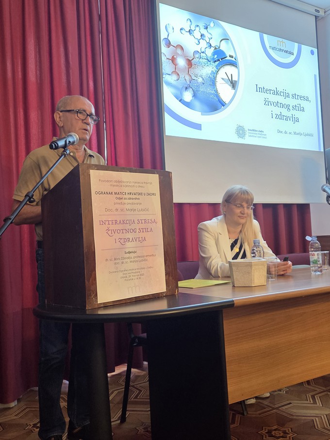 Odjel za zdravstvo Ogranka Matice hrvatske u Zadru, 29. travnja održao je predavanje doc. dr. sc. Marije Ljubičić pod nazivom Interakcija stresa, životnog stila i zdravlja. Na samom početku prisutnima se obratio dr. sc. Boris Dželalija, professor emeritus. Najavio je predavanje te samu predavačicu iznoseći nekoliko crtica iz njezinog životopisa.