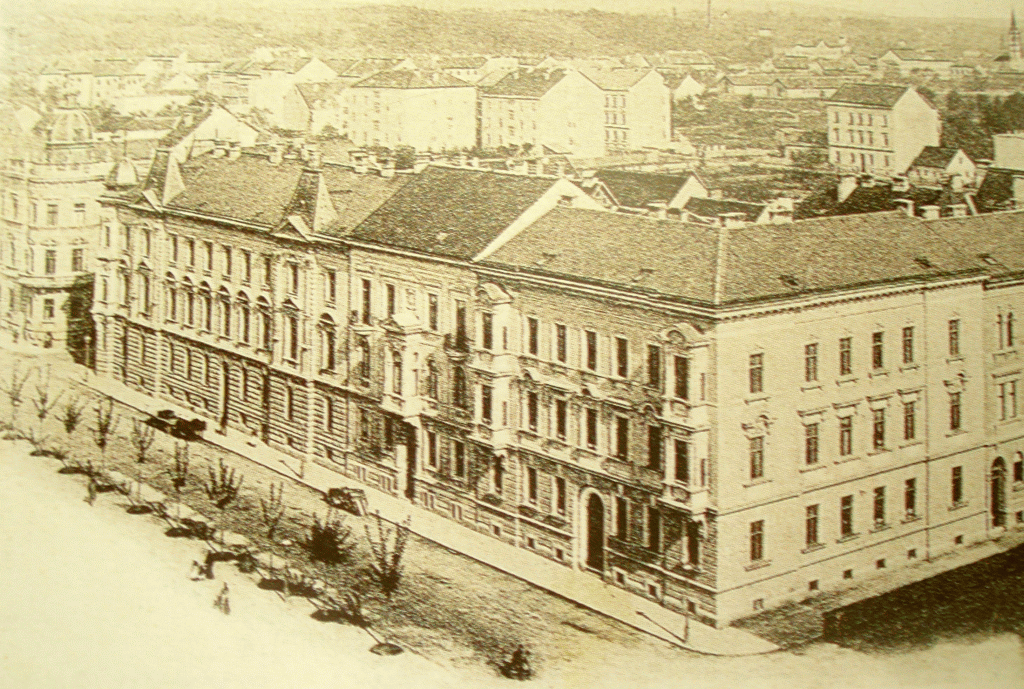 Sveučilišna zgrada (danas Pravni fakultet i Rektorat zagrebačkoga Sveučilišta) na Sajmištu 1880-ih, sjedište MH od 1882. do 1887.