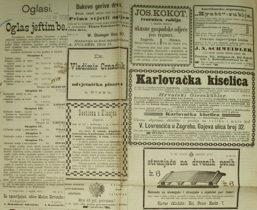 Ugovori s obrtnicima. Kondrat je dovršenu dokumentaciju predao Matici hrvatskoj 30. VI., a već 7. srpnja Matičina je uprava raspisala i u zagrebačkim novinama oglasila javnu jeftimbu (licitaciju), raspoređenu na šest građevinskih skupina s ukupnim proračunom od 43.258 for. Uprava je zaprimila 24 ponude pri čemu je postignut značajan popust (3715 for). Iznos ostvaren popustom uprava je, na prijedlog M. Antolca, stručnoga vještaka Kondratovih nacrta, odlučila namijeniti za »udobnije uređenje, povećanje i urešenje kuće«. Napovoljnije ponude poslali su ponajbolji zagrebački obrtnici (graditelj Franjo Klein ml., stolar Antun Kontak, bravar Gjuro Hammel, krovar Hinko Bauer, limar Aleksandar Maruzzi, slikar Eduard Hasse, soboslikar Dragutin Uhrl, staklar Antun Gnezda, pećari Josip Hoshstädler i Dragutin Kepert, parketarnica Pongratz). S njima su tijekom srpnja i kolovoza potpisani ugovori, a obrtnici su valjanost svoga posla morali zagarantirati polaganjem tripostotne jamčevine od ugovorene cijene u Matičinu blagajnu. Određen je i rok za dovršetak zgrade i useljenje prvih stanara (1. VIII. 1887), dok je povratak jamčevine poduzetnicima ugovoren za listopad 1888., nakon što se izvrši nadkolaudacija zgrade.