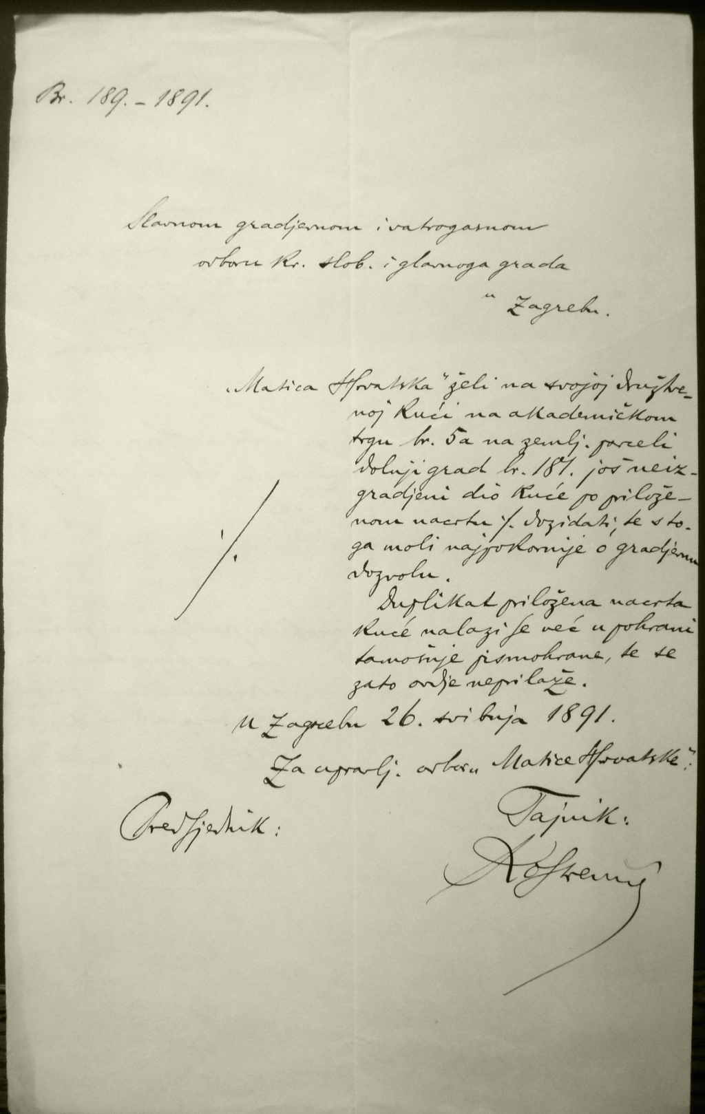 27. Koncept teksta molbe za dogradnju Matičine kuće 1891.