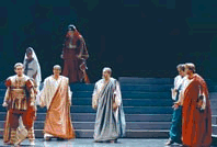 No orkestralna izražajnost, kao i nespretni rečenični sklopovi u libretu koji je napisao sam skladatelj, priječili su publici da čuje kako i o čemu pjevaju protagonisti na sceni. Diskretna Juranićeva režija, koja je nastojala ići na ruku pjevačkim potrebama, također nije dovoljno razjasnila ključne trenutke radnje i profilirala karaktere pojedinih likova. Lijepe zamrznute slike obasjane toplim bojama majstora Denija Šesnića na ogoljeloj sceni stubišta prema zamišljenom Kapitolu scenografa Žorža Draušnika (inače i kontrabasista Orkestra HNK), jednostavnošću rotacije i naglih promjena, omogućili su neprekinuti glazbeni tijek između prizora. Neutralnosti kulisa i režije oponirala je doslovna historičnost raskošnih kostima Danice Dedijer-Marčić te stilski neusklađena koreografija Marka Boldina u prizoru gozbe na početku trećega čina.