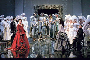 Scenografija Dalibora Laginje nadovezuje se elegancijom u prikazivanju ambijenata salona Comédie-Française te kneževskih vila i dvoraca u kojima se opera odigrava. Rotirajuća scena oštroumno je iskorištena u drugom činu za igru skrivača dviju suparnica. Baletni prizor trećega čina maštovito je zamišljen kao inverzija priče iz grčke mitologije o Parisovu sudu, ali provedba suradnice za scenski pokret Maje Marjančić nije bila dovoljno razrađena.