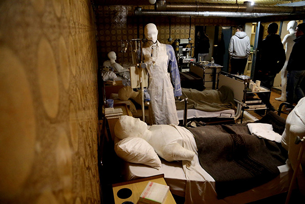 S obzirom na vizualni doživljaj najreprezentativniji dio muzejskog postava nalazi se u prostorijama (spavaonicama) atomskog skloništa čiji namještaj (uglavnom bolnički kreveti zbijeni i postavljeni jedan do drugoga ili jedan iznad drugoga) i izvorna medicinska oprema kakva se u bolnicama koristila prije tridesetak i više godina uspješno „prenose“ posjetitelja u ratno vrijeme, u kojem prema riječima dr. Bosanac „cijeli jedan grad živi pod zemljom, u skloništima i podrumima“ i u kojem su „ostale samo ruševine ispod kojih izlaze još uvijek živi ljudi“. Osim izostanka dnevnog svjetla, zbog čega se cijeli prostor skloništa doima kao da je odijeljen od ostatka svijeta, dojam mučne praznine prepune egzistencijalne nesigurnosti i nervoznoga iščekivanja sutrašnjice dodatno naglašavaju gluhe i nijeme gipsane lutke koje prikazuju ranjenike, medicinsko osoblje, djecu, novorođenčad, kao i ostale „žitelje“ bolničkog skloništa, ali i snimke radijskih izvješća Siniše Glavaševića, čiji glas, njemu svojstvenim ritmom upornosti, odjekuje klaustrofobičnim podrumskim prostorom. Dojmljiva je također prostorija čiji su zidovi obloženi zrcalima i čiji je jedini inventar crveno osvijetljen oltar u obliku kocke u kojoj se bez prestanka putem audiosnimke jedno za drugim izgovaraju imena žrtava.