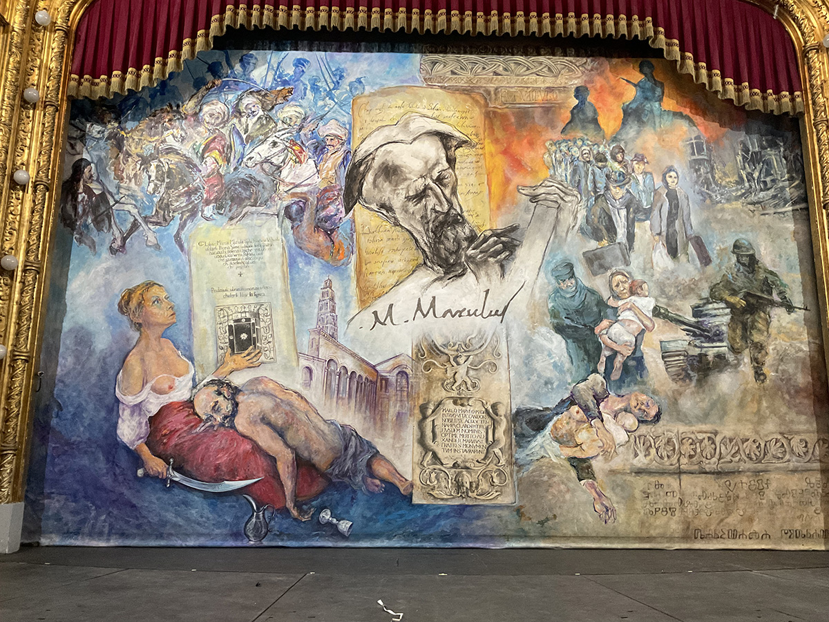 U središtu je portret Marulića skiciran prema glavi poznatog spomenika Ivana Meštrovića koji resi splitski Voćni trg, okolo je naslovnica Juditina prvotiska, skica splitskog Peristila, otisak Marulove nadgrobne ploče iz splitske crkve sv. Frane. Na rubnim dijelovima zastora prikazane su bitke Marulićeva i našega vremena; desno dolje je možebitna Marulićeva razgolićena Judita s bodežom i beživotnim Olofernom, a iznad prijeteća turska konjica sa sabljama, dok su na desnoj strani bitke i ratne žrtve našega doba, preslikani prizori vukovarskog egzodusa, dvije majke s bebama i moderni agresori sa suvremenim oružjem.