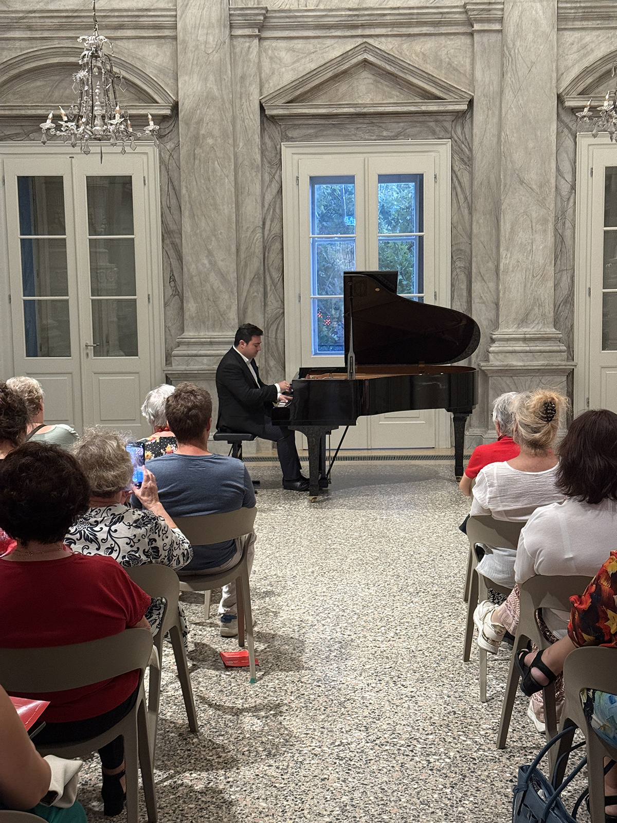 Nakon valcera uslijedila je Lisztova kasna meditacija Les jeux d’eaux à la villa d’Este, u kojoj je pokazao zavidnu kontrolu nad složenom klavirskom partiturom. Arpeggia u desnoj ruci oblikovao je s gotovo harfističkom lakoćom i kristalnom jasnoćom, dok je lijeva ruka održavala stabilnu harmonijsku osnovu. Pedalizacija je bila besprijekorno dozirana; dovoljno bogata da stvori dojam lebdećeg zvučnog vela, ali uvijek s jasno čujnim pojedinačnim glasovima. Fraze su bile oblikovane u dugim, logičnim lukovima, a suptilne agogičke varijacije davale su osjećaj prirodnog disanja glazbe, nalik valovima koji se šire i povlače. Dinamička paleta bila je jako raskošna; od eteričnih pianissima, koja su gotovo zaustavljala vrijeme, do blistavih fortissima koja su ispunjala prostor, a ipak zadržavala mekoću i puninu tona.