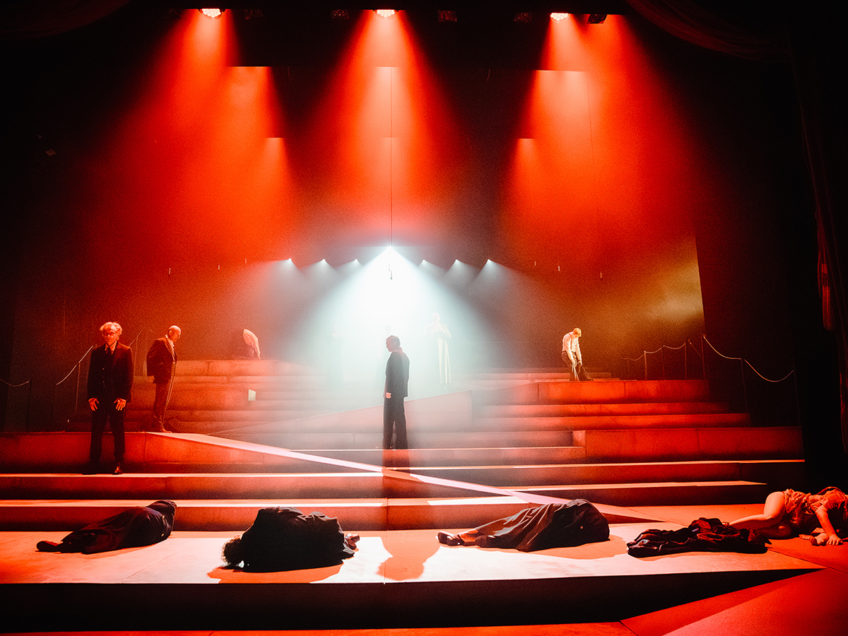 Isti princip koji gledatelja obuzima u sagledavanju dramatizacije, nalazi se i u temelju vizualnih rješenja i determinaciji mizanscene. Scenograf (Ivan Lušičić Liik, koji je ujedno i oblikovatelj svjetla) postavio je na scenu apstraktni niz razina, istovremeno stuba i rampi, po kojima se glumci premještaju. Ta metafora uspona i pada na društvenim i političkim ljestvicama, ali i efektan prostor igre, sličnog je reduktivnog potencijala u odnosu na Krležu i njegov zahvat. Istovremeno, teško se, barem za gledatelje koji su imali prilike vidjeti već brojne klasične drame i dramatizacije na scenama koje koriste sličnu varijaciju na scenografsku temu, oteti dojmu ponavljanja.