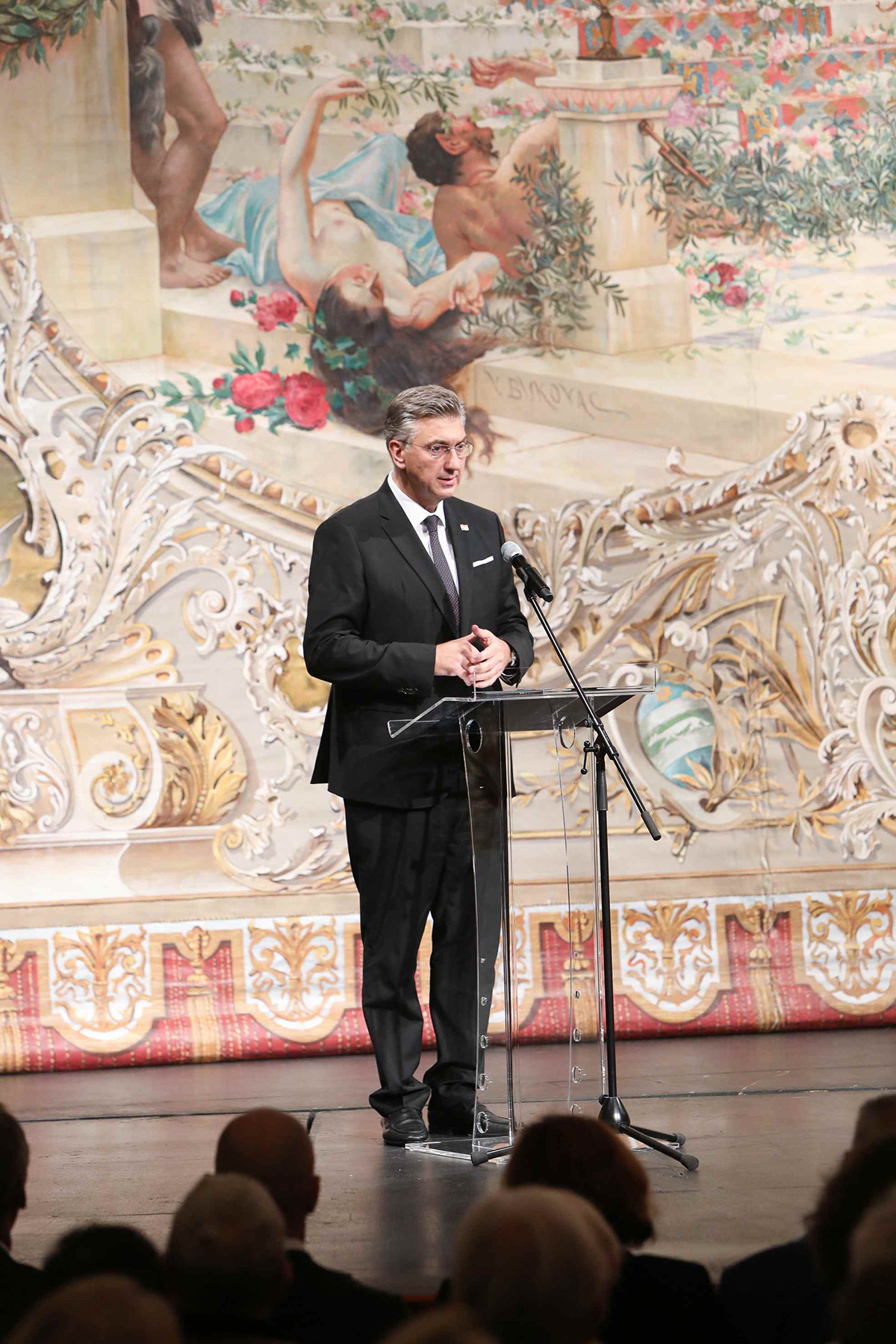 Urednica monografije Martina Petranović, predsjednik upravnog odbora Školske knjige Ante Žužul, ministrica kulture i medija Nina Obuljen Koržinek, predsjednik Vlade RH Andrej Plenković s intendanticom Ivom Hraste Sočo na promociji obljetničke monografije