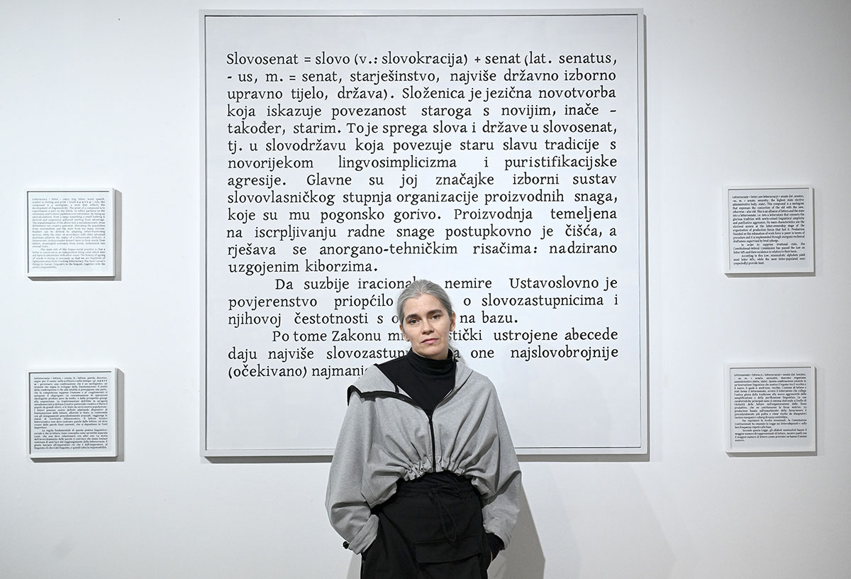 Nadahnuta Orwellovom interpretacijom totalitarnih režima u romanu 1984. i njegovim rječnikom novozbora, Zanze je za potrebe ciklusa Slovoenciklopedijske jedinice osmislila sedam tekstova u formi enciklopedijskih natuknica, tzv. novokovanica – Slovokraciju, Slovosenat, Slovoprincipiu, Slovostijeg, Slovograničnik, Slovoistinu i Slovomanifest – iza čijih se, na prvi pogled, strogo ispisanih redaka, skriva britak ironijsko-distopijski komentar društvenih okolnosti i političke manipulacije prizivajući administrativni, birokratski jezik totalitarnih struktura. U likovnom smislu slike su minimalističke i svjesno lišene gotovo svih tradicionalnih sastavnica: bijela platna uljenom su bojom minuciozno, ali bez gestualnosti, ispisana velikim tamnim slovima – kako bi bila dovoljno čitljiva slabovidnima – te „prelomljena” na način kojim se u tiskarstvu prelamaju enciklopedijske natuknice. Na taj način na podlozi ostaje samo ono što je nužno – slovo i misao. Paradoksalno, radikalnom redukcijom forme postiže se intenzivniji vizualni efekt te se otvara prostor sadržaju, a potom se kroz sadržaj aktivira percepcija gledatelja. Jednako je važan i proces kojim su djela nastajala; kako je na otvorenju naveo Igor Zidić, svako slovo rezultat je nerijetko mukotrpnog ponavljanja, koncentracije i discipline ručnog ispisivanja i iznimne slikaričine posvećenosti, a u kojima je Vanja Babić prepoznao slikovitu analogiju sa srednjovjekovnim skriptorijima.