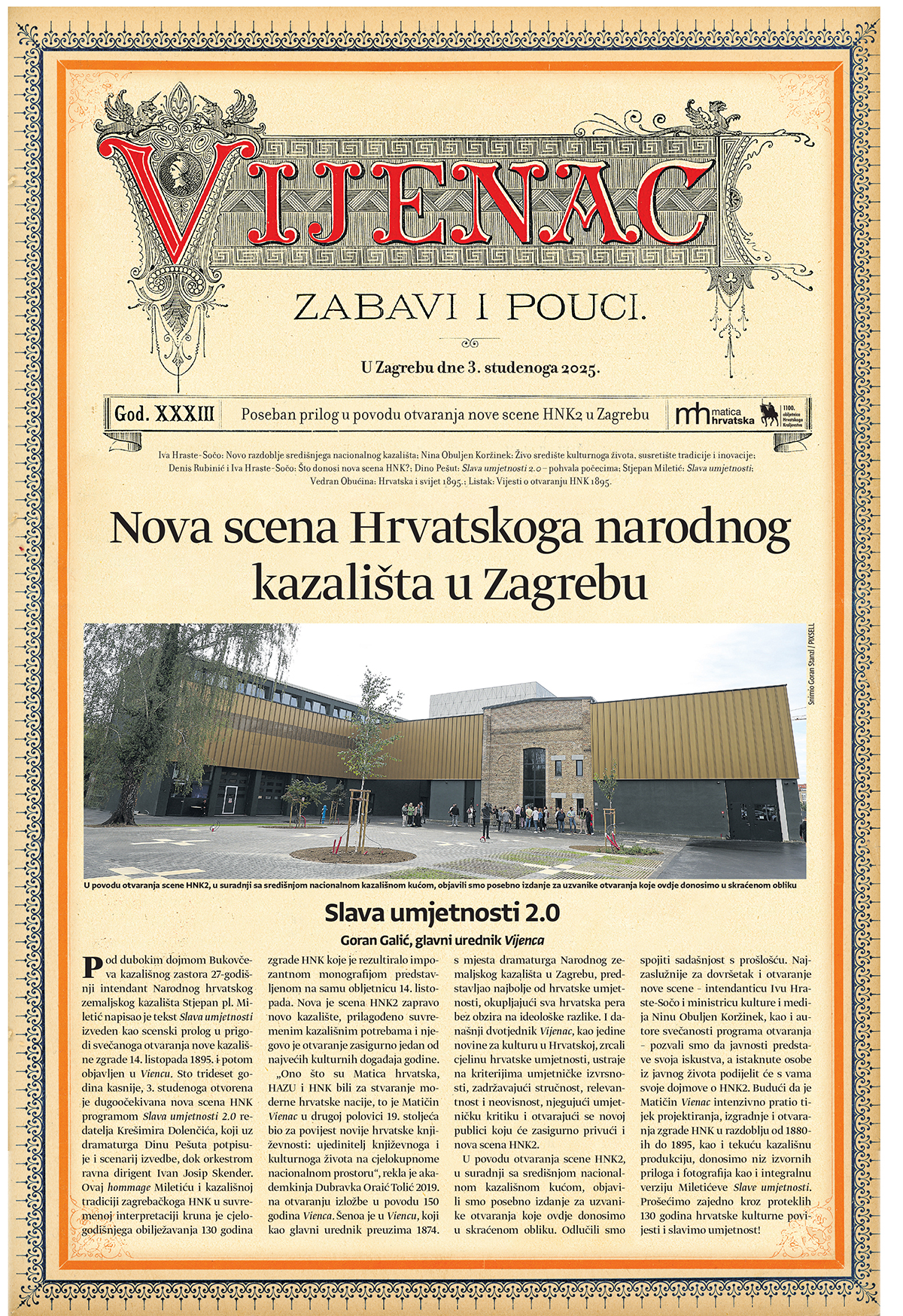 U povodu otvaranja scene HNK2, u suradnji sa središnjom nacionalnom kazališnom kućom, objavili smo posebno izdanje za uzvanike otvaranja koje ovdje donosimo u skraćenom obliku. Odlučili smo spojiti sadašnjost s prošlošću. Najzaslužnije za dovršetak i otvaranje nove scene – intendanticu Ivu Hraste-Sočo i ministricu kulture i medija Ninu Obuljen Koržinek, kao i autore svečanosti programa otvaranja – pozvali smo da javnosti predstave svoja iskustva, a istaknute osobe iz javnog života podijelit će s vama svoje dojmove o HNK2. Budući da je Matičin Vienac intenzivno pratio tijek projektiranja, izgradnje i otvaranja zgrade HNK u razdoblju od 1880-ih do 1895, kao i tekuću kazališnu produkciju, donosimo niz izvornih priloga i fotografija kao i integralnu verziju Miletićeve Slave umjetnosti. Prošećimo zajedno kroz proteklih 130 godina hrvatske kulturne povijesti i slavimo umjetnost!