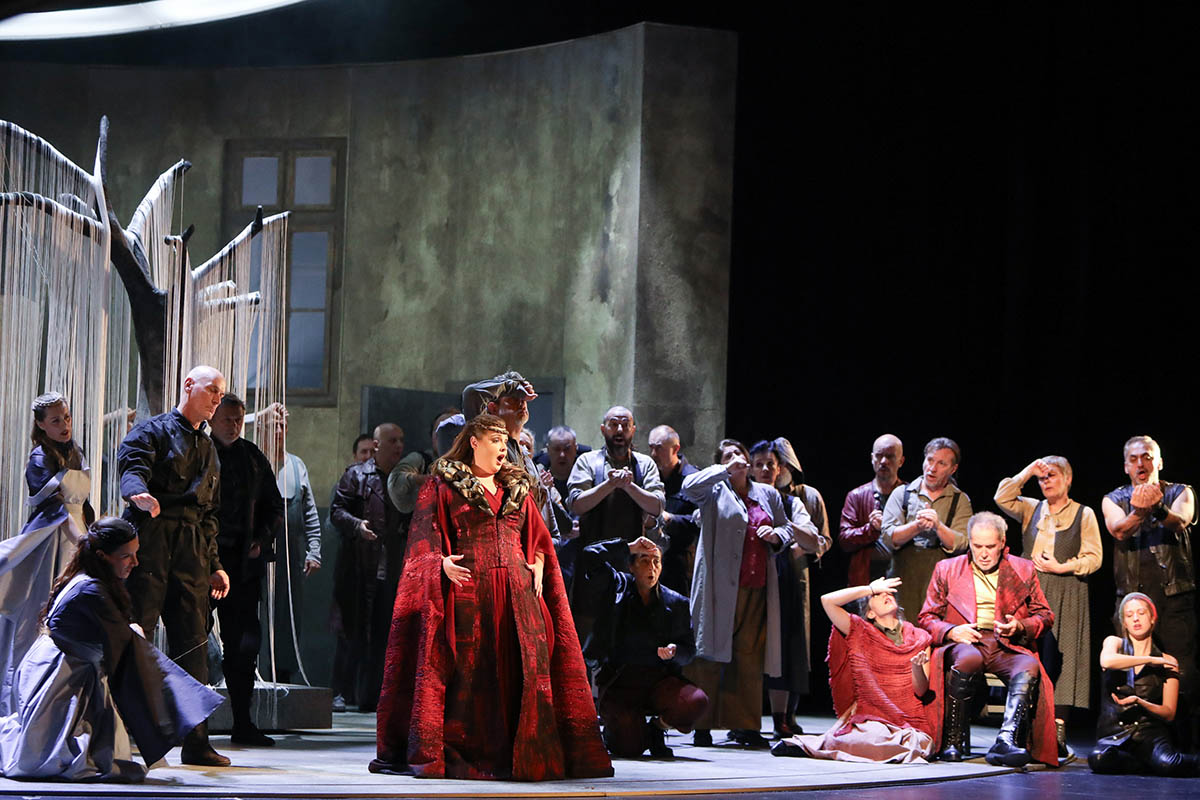 Martina Gresia kao Norma i Ivica Čikeš kao Oroveso uz članove Zbora HNK u Zagrebu / Snimila Mara Bratoš