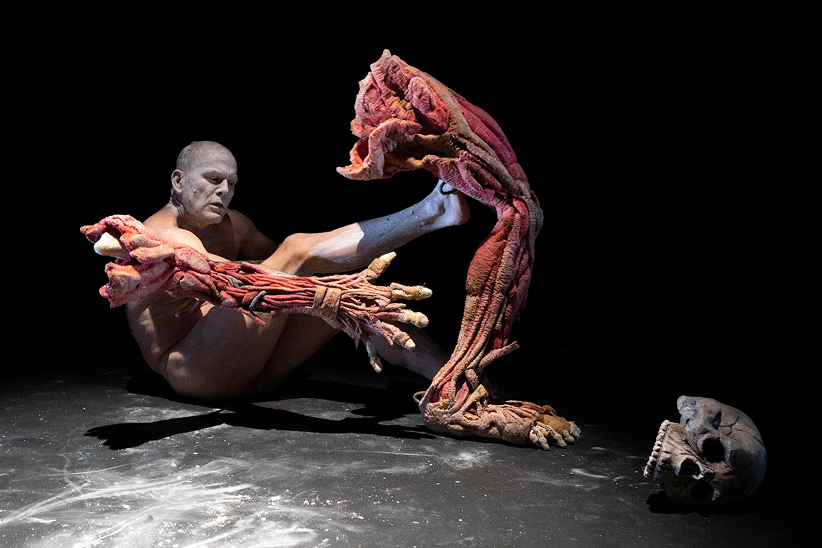 U mraku scene HKD Sušak, ispod crne tkanine lagano izviruje izvođač premazan bijelom bojom. Nalik je plesaču japanskog buta. Oko njega su prekriveni muzički stalci. Glazba je elektronička. Tijekom više sekvenci koreografije izvođač uzima prvo lubanju, zatim lagano noge i mišiće, animirajući ih precizno, gotovo usporeno, da bi prešao na ruku. Iako u početku odvojeni, dijelovi tijela postupno se spajaju pa će ruka milovati, grliti lubanju, ali će i je i odbaciti. Mesožderka će ispljunuti oko koje nas gleda, srce će kucati u rukama. Dijelovi tijela izrađeni od poliuretanske gume i recikliranih materijala nalikuju mekšoj, grotesknijoj varijanti izložaka koje smo mogli vidjeti na izložbi Bodies 2.0 u Klovićevim dvorima i zahtijevaju nevjerojatnu preciznost u animaciji. Izmjenjuju se crno i bijelo, svjetlo i tama (Ayumu Poe Segusa), mitski cvrkut ptica i šum valova s elektronikom u partiturama Marka Brucknera. Susreću se život koji zamire i onaj koji tek dolazi, u malenom i velikom kosturu. Starost će nježno zibati mladost, mladost će tražiti stisak života.