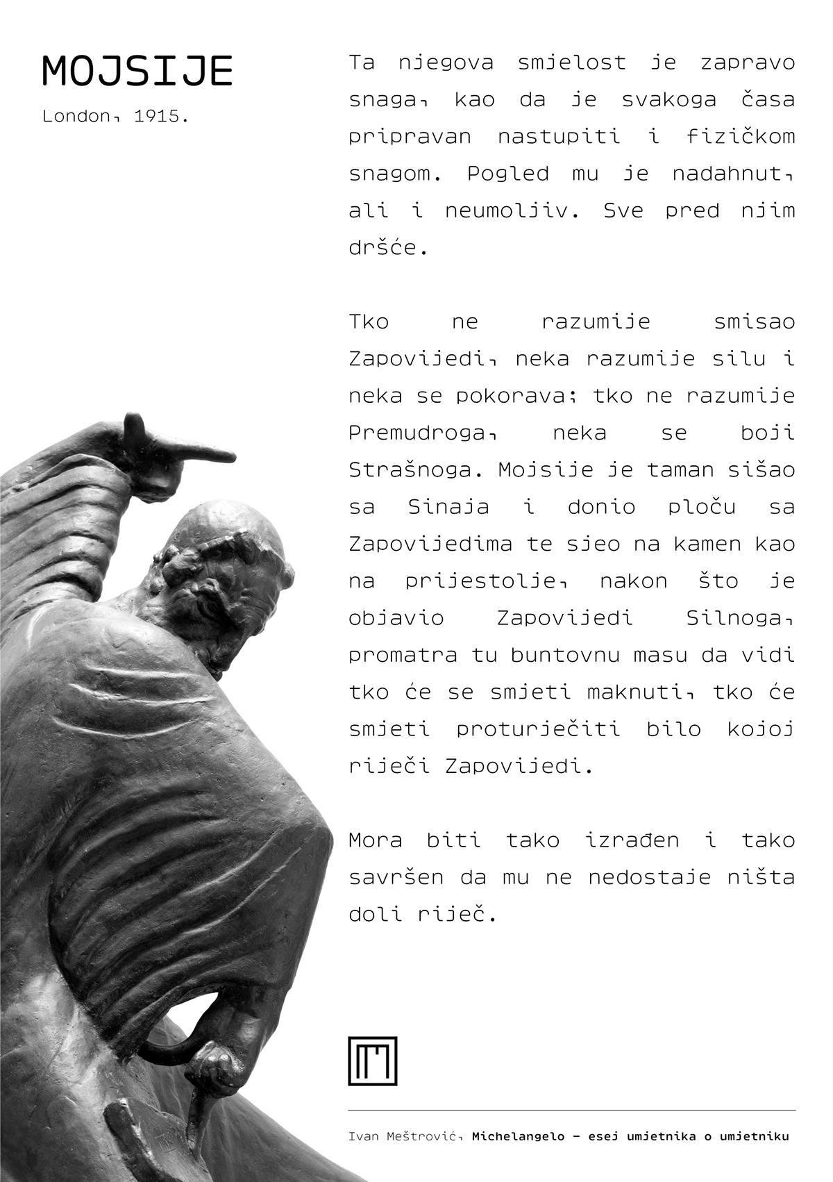 Pažljivim odabirom citata, kako navodi Iris Marinović, publici se pruža izravan uvid u Meštrovićevu inspiraciju i viđenje njegove umjetnosti kroz oči njegovih suvremenika. Ovdje se ne koriste uobičajeni retrospektivni interpretativni tekstovi koji bi umjetnikovo djelo objašnjavali iz današnje perspektive, već autentična promišljanja i svjedočanstva iz njegova vremena. U citatima preuzetima iz Meštrovićevih tekstova objavljenih u knjigama Vatra i opekline (1998) te Michelangelo – esej umjetnika o umjetniku (2010), kao i iz pisama koja je razmjenjivao s Ivom Tartagliom, umjetnik sam progovara o vlastitim nadahnućima i razlozima za odabir motiva skulptura. Ostatak tekstova na karticama prenosi komentare njegove druge supruge Olge i kćeri Marice, čiji glasovi pružaju uvid u umjetnikov rad iz intimnije perspektive, te stručna zapažanja Meštrovićevih biografa Duška Kečkemeta i Jamesa Bonea. Ovi citati ne služe nužno edukativnoj svrsi, nego djeluju kao poziv na dublje istraživanje Meštrovićeva opusa.