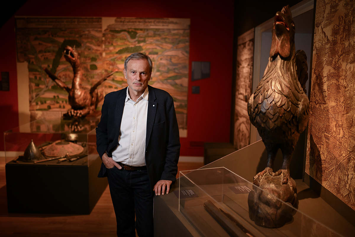 Autor izložbe Dino Milinović s pulenom u obliku pijetla iz Gradskog muzeja u Trogiru / Snimio Josip Regović / PIXSELL