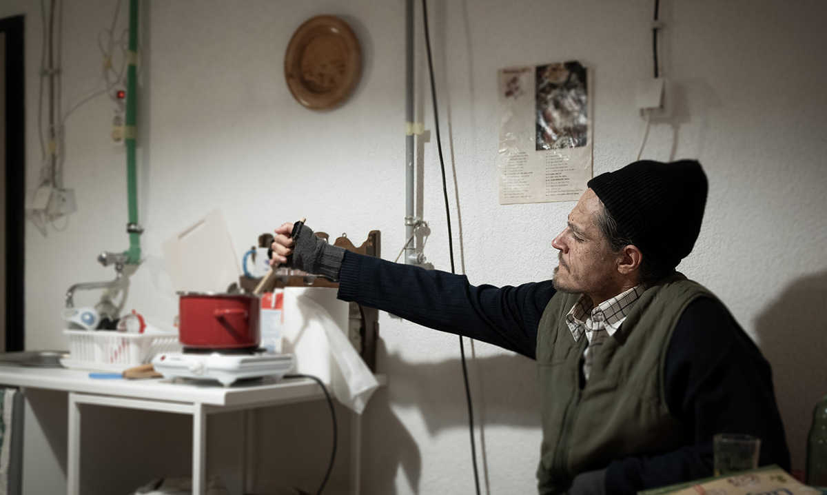 U tom skromnom stančiću sve je dotrajalo, ali funkcionalno, mnogi predmeti kojima smo okruženi prizivaju i naša sjećanja na djedove ili bake, pa se brzo udomaćujemo i uranjamo u svijet u kojemu se jasne granice između fikcije i stvarnosti gube. Kad smo se svi udobno smjestili, u prostoriju furiozno ulazi starac i upućuje ljutite povike, vezane za vlasništvo kuće, nekome izvana. Prvih petnaestak minuta on ne govori mnogo, tek mumlja sebi nešto u bradu, ali iz pogleda i trzaja lica mi čujemo njegove uznemirene unutrašnje misli i osjećamo dubinu samoće koja dugo vlada u njegovom životu. Lovro Rimac pomno je istražio svaki detalj kako bi što vjernije utjelovio svoje lice: njegov je pogled mrk i umoran, brada mu je isturena, leđa blago savijena, a hod otežan, ruke mu drhte, no glava ga još dobro služi te uz sjajnu masku Ive Lee Dežmar fantastično stvara sveobuhvatan portret jedne duboko osamljene i tužne osobe treće životne dobi. Žena mu je umrla, sin se odselio i on živi potpuno sam, željan društva. Zato živne čim se počne obraćati gledateljima koji sjede za stolom – glas mu postaje energičniji, čelo vedrije, pogled radosniji, hod lakši i okretniji. Kao svi dobri domaćini, nudi nas špekom i vinom i živahno nam pripovijeda anegdote iz svog života, prisjećajući se na starom, pomalo zaboravljenom, samoborskom govoru mladosti i nekadašnjih vremena. Turobni plašt kao da je našim dolaskom nestao.