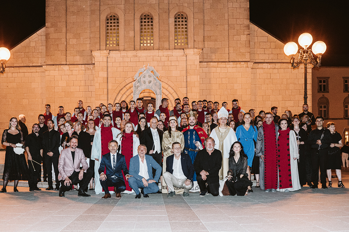 Sudionici praizvedbe glazbeno-scenske legende Krunidba kralja Tomislava u Tomislavgradu koju su priredili Matica hrvatska i Vijeće MH u BiH s HNK-om u Mostaru, Splitu i Zagrebu te Centrom za kulturu Tomislavgrad
