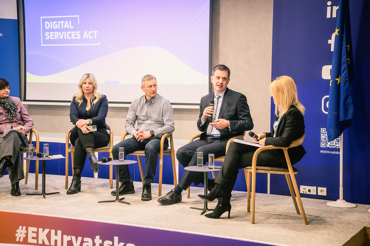Akt o digitalnim uslugama uvodi ta pravila u digitalni prostor, objasnila je voditeljica Predstavništva Europske komisije u Hrvatskoj Zrinka Ujević. Naglasila je kako Uredba ima ključnu ulogu u odgovoru na internetske prijetnje: od zaštite maloljetnika i zaustavljanja financijskih prijevara do suzbijanja širenja dezinformacija. Iznimno je važna zato što potvrđuje da digitalni prostor nije izvan zakona te povezuje slobodu govora s odgovornošću. Savjetnica za Akt o digitalnim uslugama u Glavnoj upravi za komunikacijske mreže, sadržaje i tehnologije Europske komisije Milana Brkić ističe da Komisija trenutno vodi 15 postupaka protiv velikih internetskih platformi, uz više od 150 zahtjeva za dostavu informacija. Platformi X, zbog kršenja obveze transparentnosti prema DSA, u prosincu 2025. izrečena je kazna od 120 milijuna eura zbog „obveza transparentnosti“ iz Akta o digitalnim uslugama. Europska komisija smatra da je X odgovoran za ugrožavanje prava korisnika i izbjegavanje odgovornosti što može dovesti do prijevara, lažnog predstavljanja i drugih oblika manipulacije.