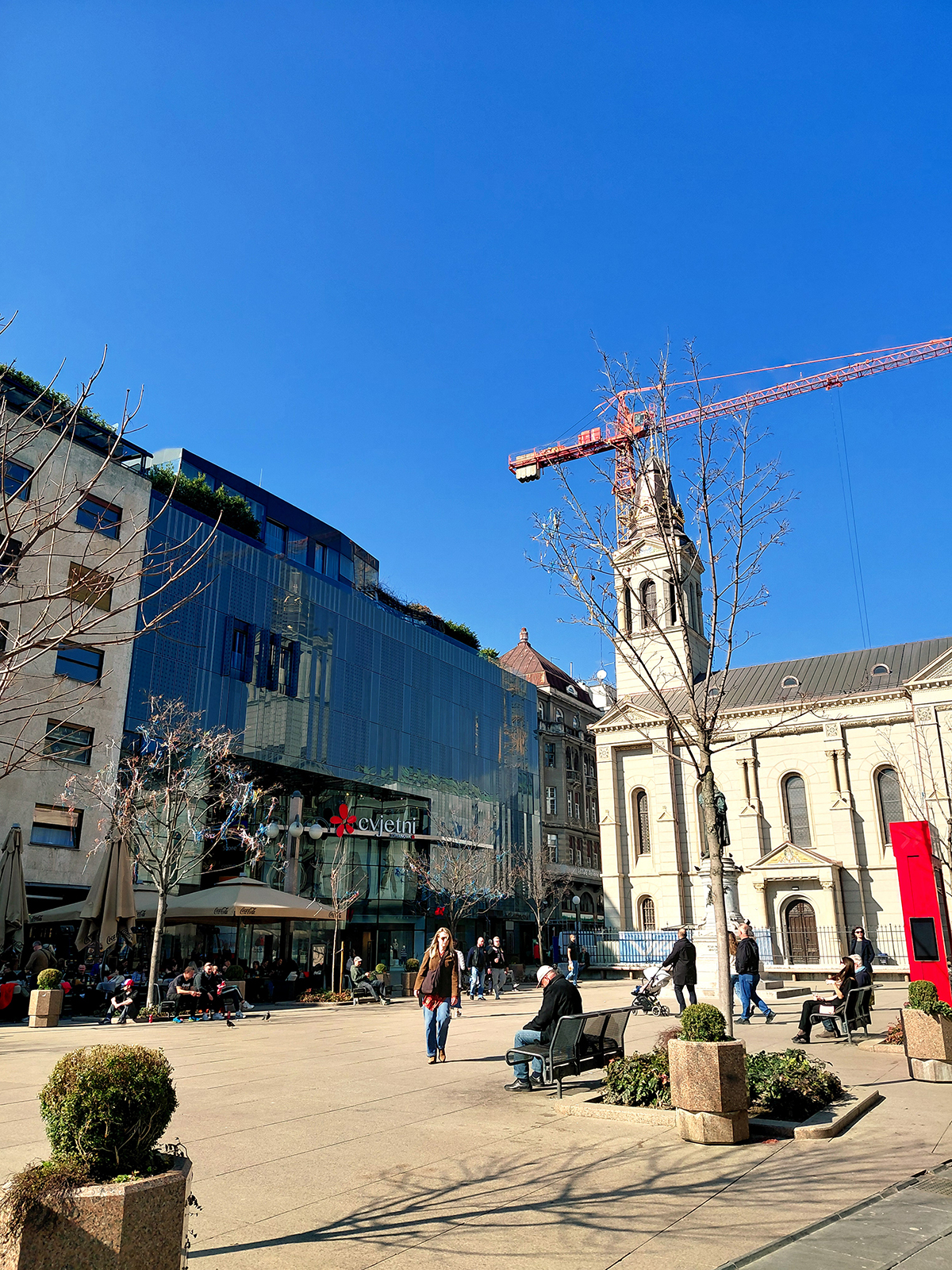 Na tom trgu, premda ima dosta mjesta za sjedenje, ne sjedim često. Zapravo, otkako znam za sebe, ovim sam trgom najprije samo prolazila, jer u vrijeme svoje rane mladosti još uopće nisam nikamo sjedala na kavu, a još manje udovoljavala sebi za svaki ćef. Tim sam trgom godinama prolazila svaki dan prema svojoj osmogodišnjoj školi, onoj u Varšavskoj ulici 17 (a to nije ona popularnija „s velikim dvorištem“; ona je preko puta na broju 18). Naravno, na sam trg vodio me prolaz Oktogon, u kojem se tada ne bih zadržavala, jer valjalo je u školu stići na vrijeme. Druga je pjesma bila kad sam išla iz škole kući. Onda se baš i nisam žurila. Istini za volju, taj vrlo lijepi prolaz, koji se po projektu Josipa pl. Vancaša počeo graditi 1898. kao monumentalna palača Prve hrvatske štedionice, bio je nekoć mnogo življi nego što je danas. Najživlje je bilo pod kupolom u sredini, osobito oko dućana koji smo kolokvijalno zvali „Kod slijepaca“. Rukotvorine slijepih osoba bile su izložene do polovice proširenja nalik malom trgu, tu se imalo što vidjeti, pa su se ljudi češće zadržavali u tom dijelu Oktogona i zbog napasanja očiju, ali i zbog kupnje (pletenih cekera, rogožara, raznih drvenih kuhinjskih potrepština i sl.).