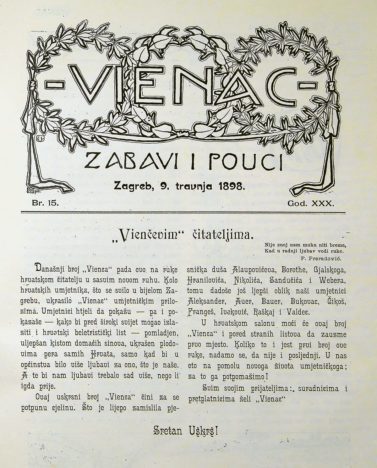 Kako je izgledao uskršnji Vienac iz 1898. godine? Svježe, drukčije, moderno, pomlađeno, secesijski. Već je logo Vienca na naslovnici, rješenje Bele Čikoša Sesije, grafički razigran, posebno u smjelom odabiru tipografije. Uokviruju ga tri vijenca od tri različite vrste bilja, uvezana bijelom vrpcom. Ispod logotipa, objavljen je uvodnik urednika Bartola Inhofa Vienčevim čitateljima koji otvara citat Petra Preradovića: „Nije znoj nam muka niti breme / Kad u radnji ljubav vodi ruke.“