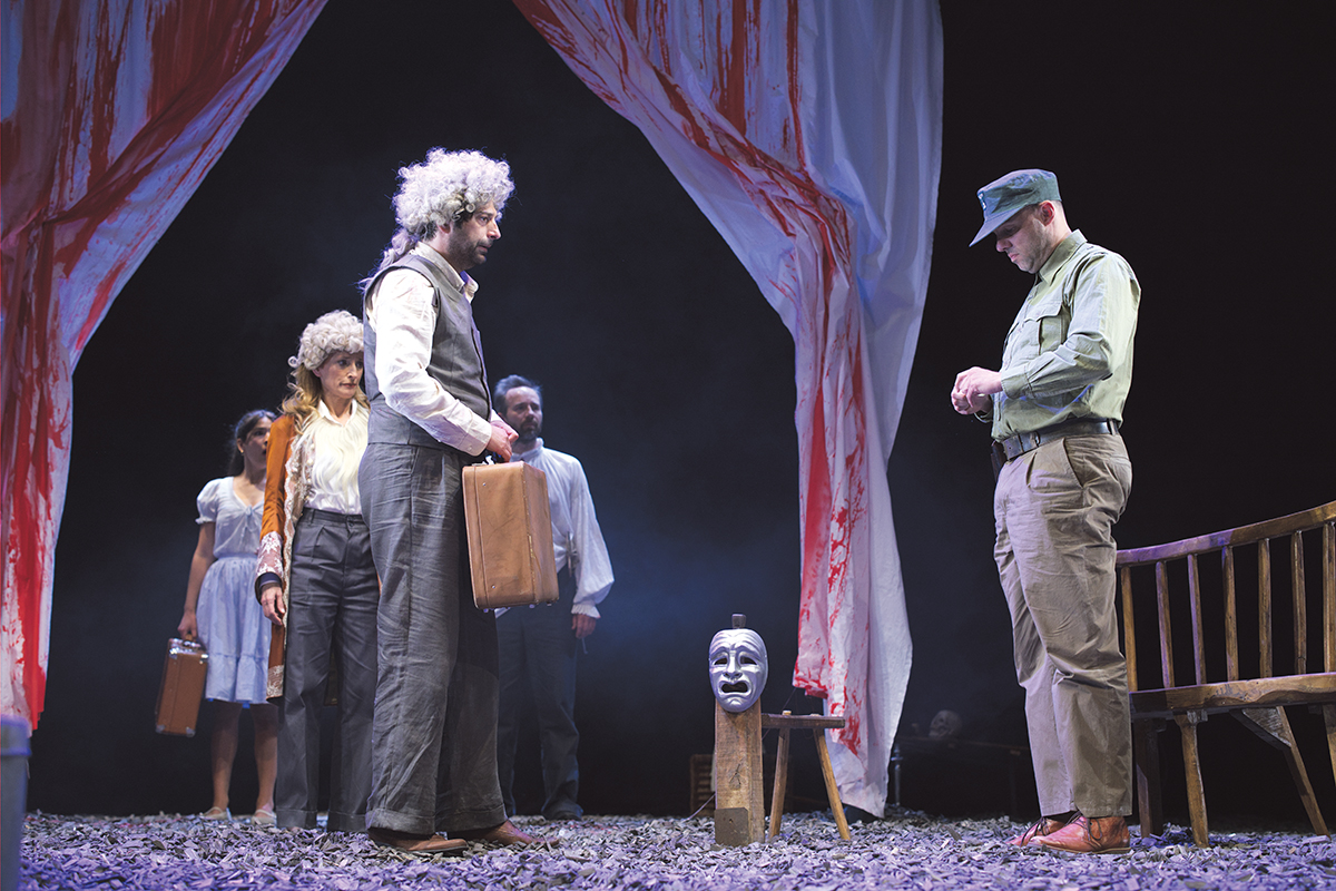 Scena je uglavnom prazna, pod je prikriven suhim lišćem i zemljom (scenografija Vanja Magić) što vizualno slika turobno mjesto opustošeno ratom. Na sredini je postavljeno bijelo platno s funkcijom zastora iza kojega se ponajviše skrivaju glumci putujuće trupe (Borko Perić, Marko Makovičić, Anita Matić Delić i Josipa Anković), kao da je to platno neka granica sigurnog kruga gdje se mogu sakriti. Tijekom trajanja predstave po bijelom će se platnu slijevati crvena boja jasno signalizirajući stradavanja, ali i tenziju među likovima. Platno će poslužiti i pred kraj za prikaz animacije brutalne scene nasilja koja previše odskače od zadane estetike i režije, djelujući kao lagano rješenje za izbjegavanje igranja nasilja na pozornici. Očekivano, postoji antagonizam prema glumcima od strane sugrađana i ostatka ansambla (Dražen Čuček, Ozren Opačić, Tarik Filipović, Damir Poljičak, Ines Bojanić, Ornela Vištica i Josip Brakus), ti ljudi pogođeni ratom ne pokazuju razumijevanje prema glumačkom poslu, niti vide umjetnost kao opciju eskapizma od depresivne stvarnosti u kojoj se nalaze.