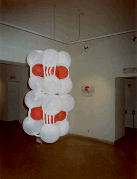 Skulptor Davorin Žitnik se tijekom svojega stvaralaštva okušao u više različitih materijala. Najprije je to bio onaj, najtradicionalniji i možda najskulptorskiji od svih - kamen. Upravo u njemu Davorin će, po vlastitom priznanju, pronaći sebe kao li-kovnog umjetnika te izraditi niz skulptura koje je karakterizirala neprijeporna izvorna sirovost, začudan energetski naboj te od-mjereno tretiranje formi. Već su tada neki od njegovih kolega umjetnika zamijetili kako je riječ o autoru posve osviještenih i beskompromisnih likovnih nazora odnos-no postupaka. Isto tako, ništa manje zani-mljivi nisu bili niti Davorinovi uratci u drvu. Neobuzdana stvaralačka znatiželja osnažena lucidnim darom za opažanje obli-kovnog potencijala što ga skrivaju obični, naoko posve nezanimljivi i banalni pred-meti iz svakodnevnog života, nagnat će ga, međutim, na iskorak u nešto posve novo i drugačije. Najnovije Davorinove skulptu-re/instalacije, naime, ne posjeduju više ništa od izvornosti i mase prirodnih mate-rijala; one su posve sintetičke i gotovo bestežinske. 0 čemu se zapravo radi? Svoje recentne skulpture/instalacije Davorin u cijelosti »konstruira« od dječjih balona i ki-rurških rukavica. Po dvije bijele rukavice on će napuniti zrakom te im spojiti prste, a u »rešetkastu« strukturu između ugradit će također napuhani dječji balon u boji. Na taj način nastaje izrazito organička »mole-kularna« struktura koja se potom umnaža pa cjelokupna skulptura/instalacija raste u skladu sa zadatostima okolnog izloženog prostora. A upravo je uloga prostora kod ovih radova izrazito zanimljiva. Prostor u njihovom slučaju na određeni način igra ulogu i »pozitiva« i »negativa« cjelokupne likovne situacije! Gledano izvana on, naime, na tradicionalan način predstavlja prilagodljivu opnu unutar koje materijal egzistira i ostvaruje svoju trodimenzional-nu vizualnu prepoznatljivost. Iznutra, me-đutim, situacija je dijametralno suprotna jer se sada materijal pretvara u opnu što se na jednak način odnosi prema zatvorenom prostoru. Nije pretjerano reći kako ovakva prostorno-tvarna dijalektika realizirana kroz umnažanje i usklađivanje izvorno dvaju tipova svojevrsnih ready-made objekata neosporno predstavlja zanimljiv i osvježavajući prilog likovnom životu Zagreba.