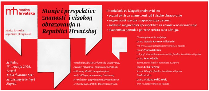 Srijeda, 15. travnja 2026. u 12 sati, Dvorana Ljudevita Jonkea (Mala dvorana MH)