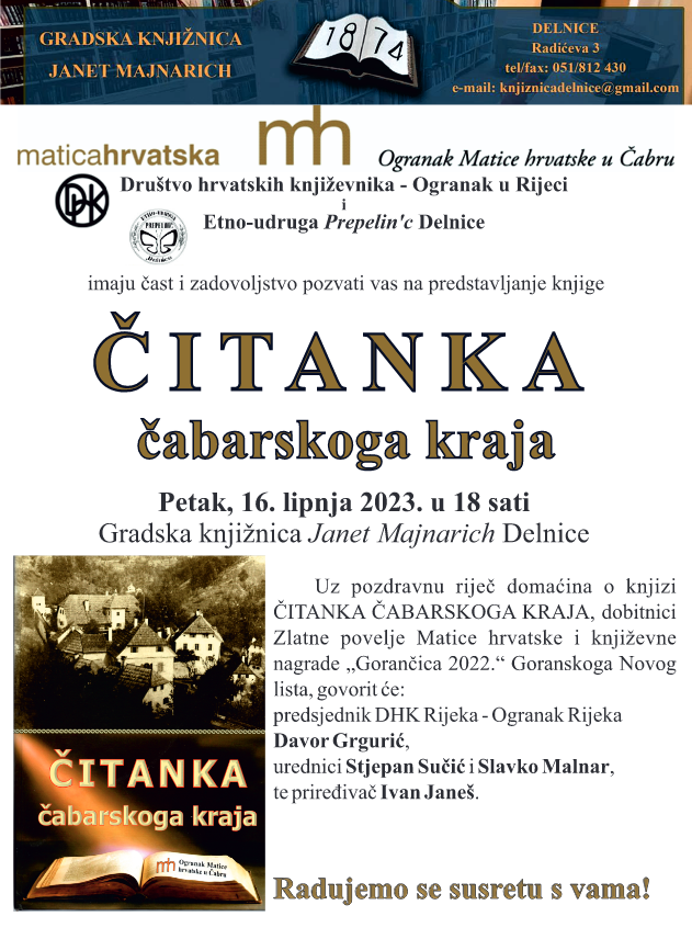 Uz pozdravnu riječ domaćina o knjizi ČITANKA ČABARSKOGA KRAJA, dobitnici Zlatne povelje Matice hrvatske i književne nagrade „Gorančica 2022.“ Goranskoga Novog lista, govorit će: