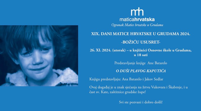 Utorak 26. studenoga 2024. godine u 18 sati. Knjižnica Osnovne škole u Grudama.
